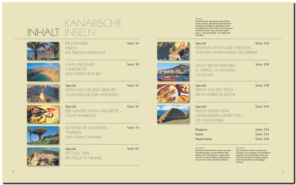 Über 250 Bilder zeigen die Kanarischen Inseln von Lanzarote bis El Hierro in all ihren Facetten. Sechs Specials berichten über Vulkanismus, den Künstler César Manrique, den Pico del Teide, die typischen Feste, kulinarische Besonderheiten und die geheimnisvollen Altkanarier.