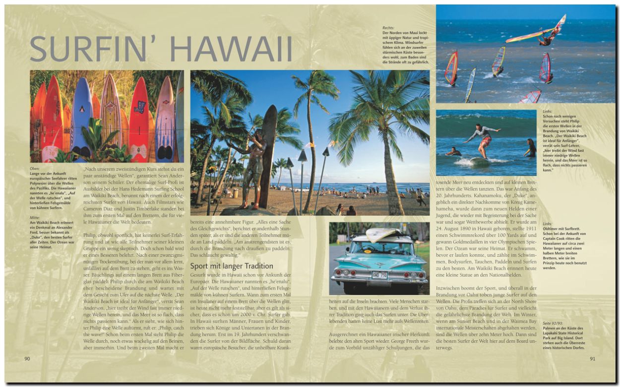 Über 230 Bilder zeigen die Inseln in all ihren Facetten. Sechs Specials berichten unter anderem über die hawaiische Küche, die spektakulären Vulkane, insbesondere im Hawaiian Volcanoes National Park, das Surfen, das auf den Inseln eine lange Tradition hat, sowie über eine „Traumschiffreise“ zwischen den Eilanden.