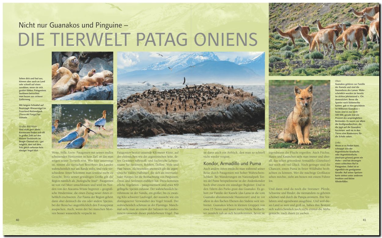 Über 240 Bilder zeigen Patagonien in seiner ganzen Vielfalt. Sechs Specials berichten über Kap Hoorn - das stürmischste Eck der Welt, die Nationalparks, die gewaltigen Gletscher, den Mythos Patagonien, die einzigartige Tierwelt und die Geschichte der Entdeckung.