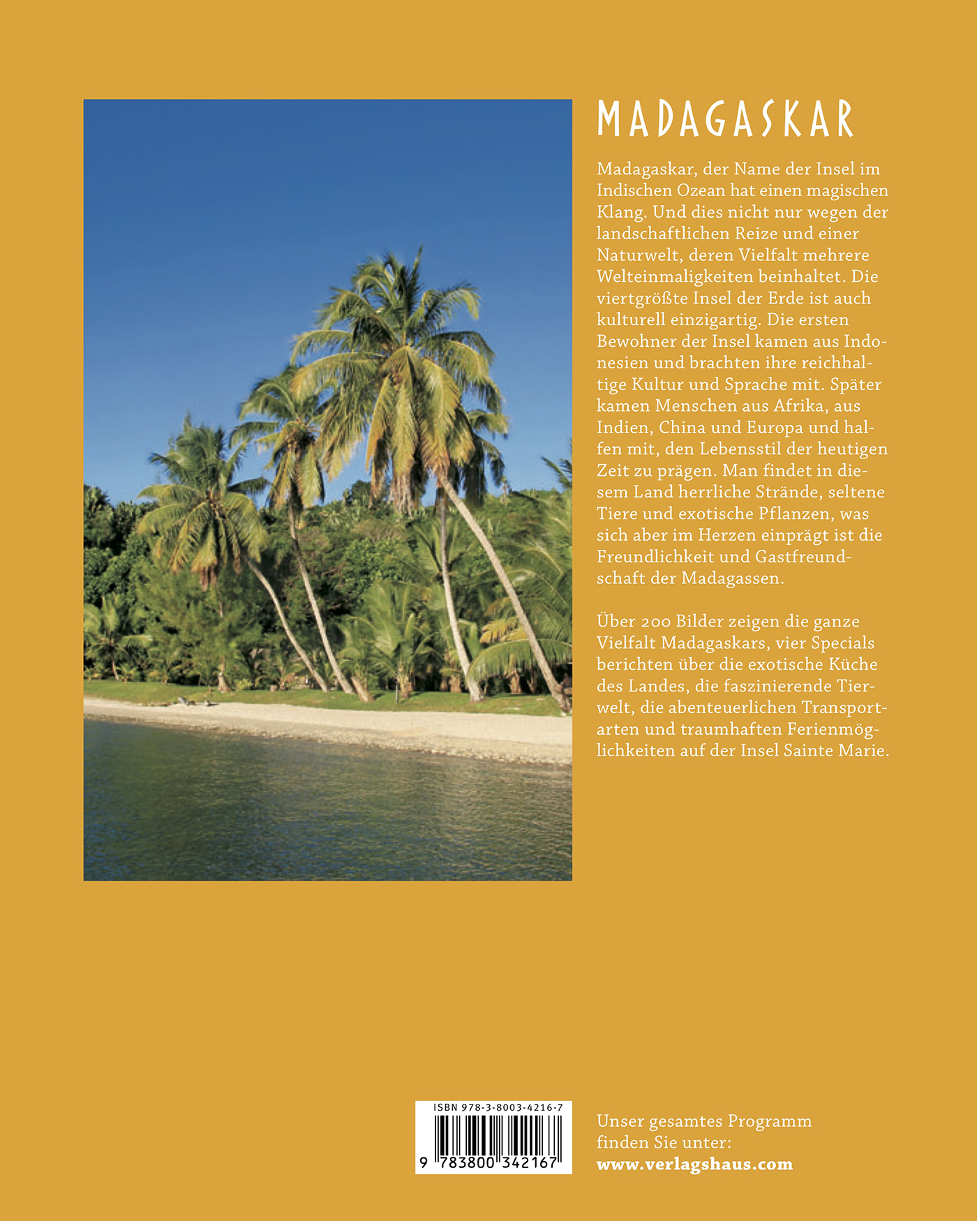 | Schlagworte | Affenbrotbaum • Afrika • Antananarivo • Antsiranana • Baie d'Antongil • Bildband • Fianarntsoa • Indischer Ozean • Katta • Lemuren • Madagaskar • Madagaskar; Bildband • Mahajanga • Manakara • Maromokotro • Morondava • Reisebildband • Sainte Marie • Toamasina • Tolagnaro • Toliara |