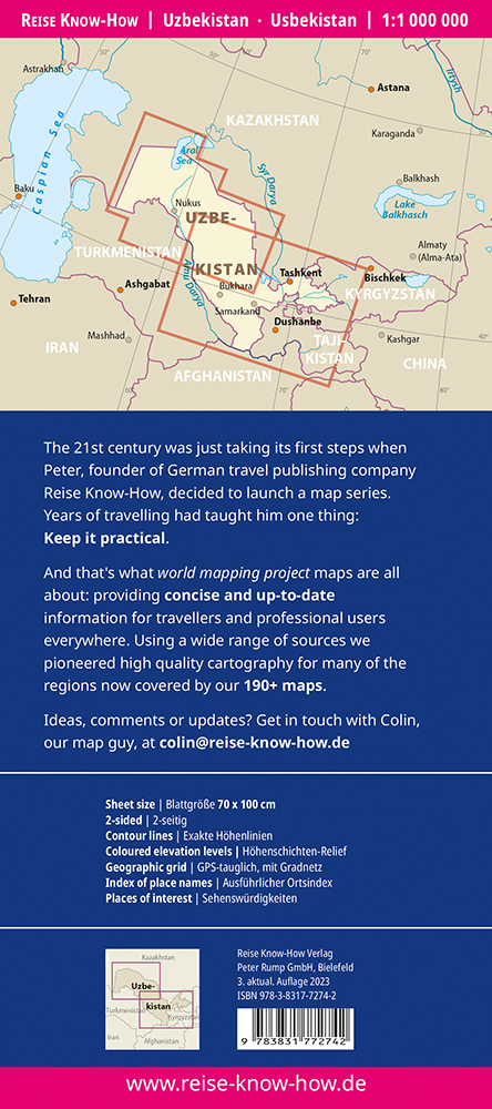 | Schlagworte | 2023 • Atlas • Autokarte • GPS-tauglich • Landkarte • map • Straßenkarte • Taschkent • Usbekistan • Usbekistan, Karte • Usbekistan; Karten • WMP • Zentralasien • Zentral-Asien |