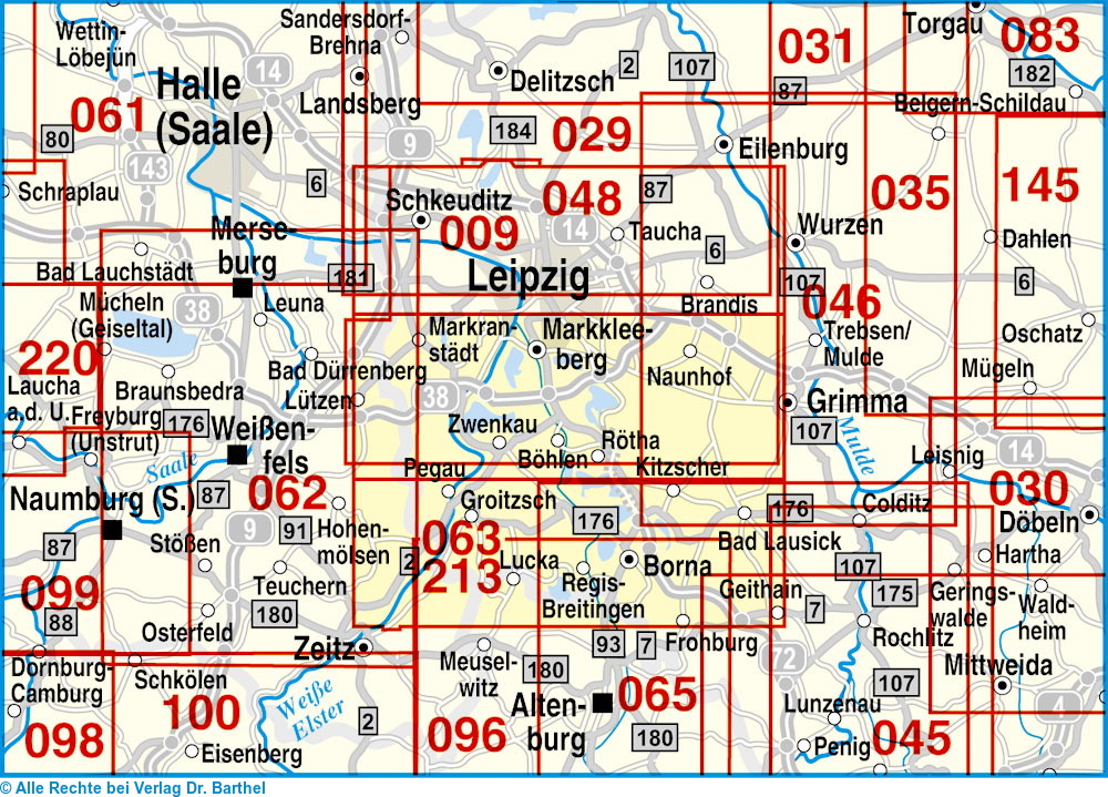 | Schlagworte | Bad Dürrenberg, Bad Lausick, Belgershain, Böhlen, Borna, Brandis, Colditz, Deutzen, Elstertrebnitz, Espenhain, Frohburg, Geithain, Grimma, • Groitzsch, Großpösna, Haselbach, Hohenmölsen, Kitzscher, Leipzig, Leuna, Lucka, Lützen, Markkleeberg, Markranstädt, Meuselwitz, Naunhof, • Leipziger Neuseenland, Karte; Radkarte • Leipziger Neuseenland, Karte; Wanderkarte • Leipziger Neuseenland; Radkarte • Leipziger Neuseenland; Wanderkarte • Leipzig (Umgebung), Karte; Radkarte • Leipzig (Umgebung), Karte; Wanderkarte • Leipzig (Umgebung); Radkarten • Leipzig (Umgebung); Wanderkarten • Neukieritzsch, Otterwisch, Parthenstein, Pegau, Regis-Breitingen, Rötha, Treben, Trebsen/Mulde, Zeitz, Zwenkau Zwenkauer See, |