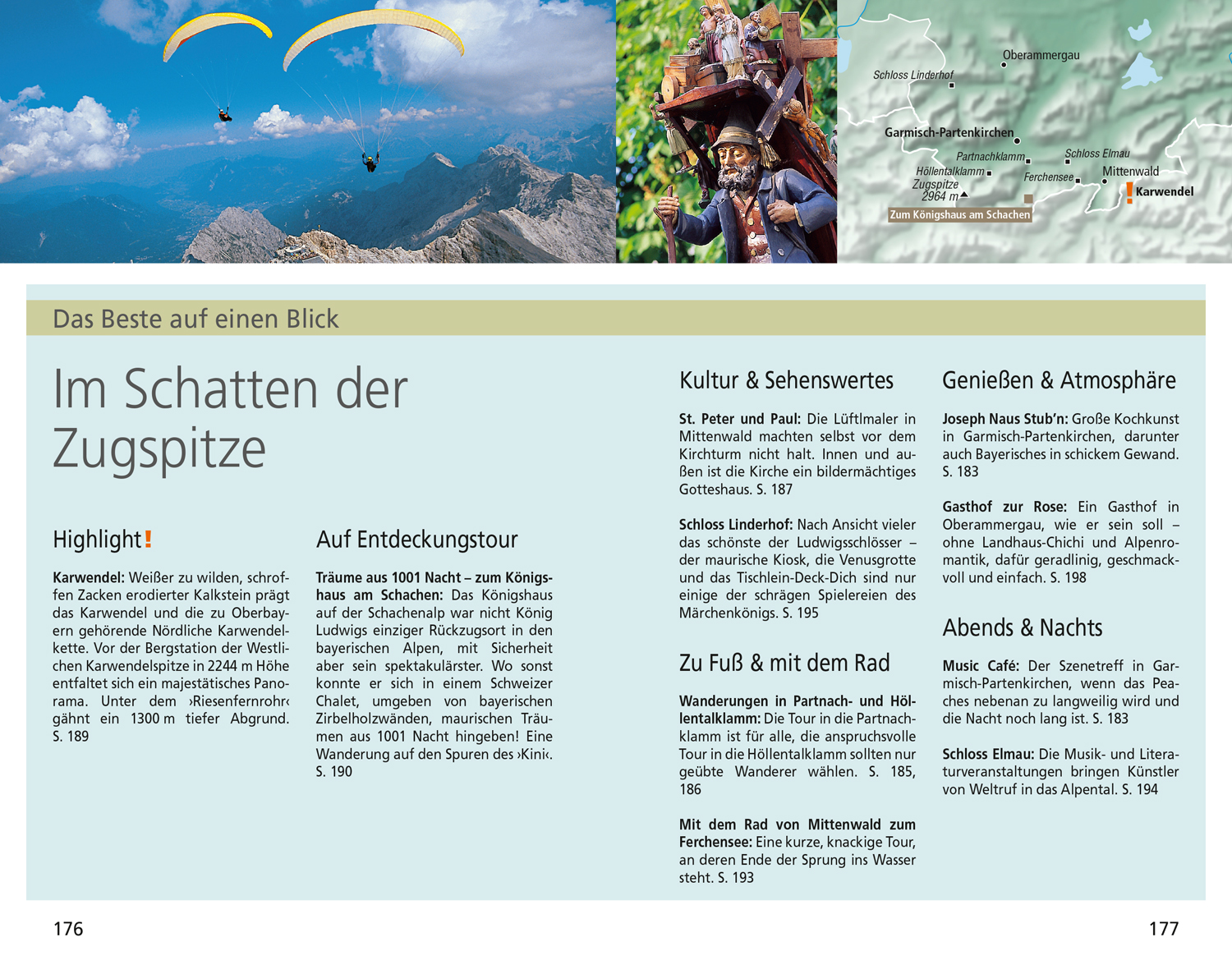 Ein besonderes Plus des Reiseführers sind mehrere Wander- und Radtourbeschreibungen mit Detailkarten; sie führen durch die Höllentalklamm, ins ruhige Murnauer Moos oder zu fantastischen Aussichtspunkten, wie z.B. auf dem Herzogstand.