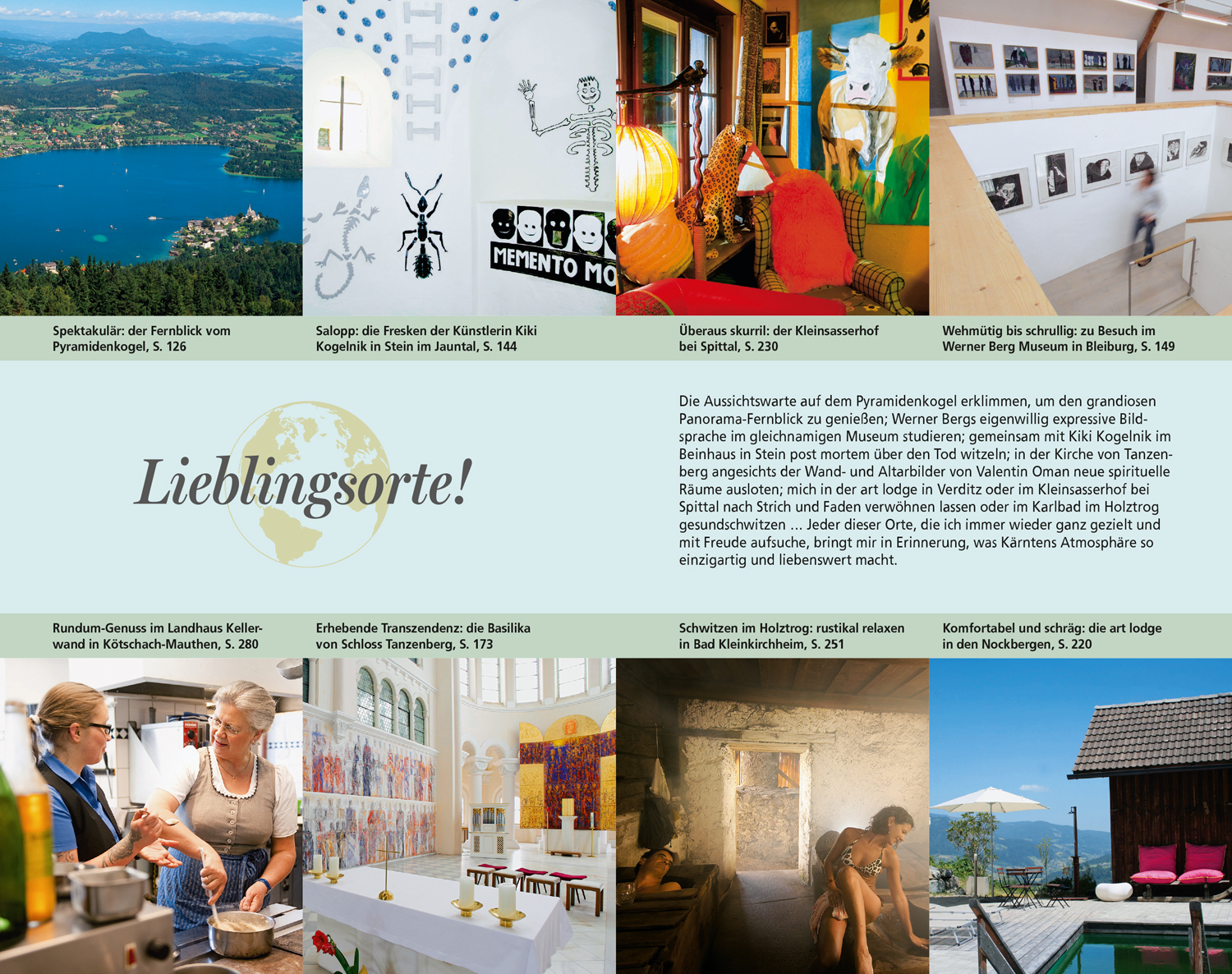 Kärnten persönlich. Reiseinfos, Adressen, Websites. Magazinteil (Panorama) mit Daten, Essays, Hintergründen. Klagenfurth und Wörthersee. Rosental, Jauntal und Lavanttal. Zollfeld und Umgebung. Metnitztal, Gurktal und Görtschitztal. Villach, Ossiacher See und Umgebung. Spittal, Millstätter See und Liesertal. Mölltal und Hohe Tauern. Oberes Drautal, Gailtal und Lesachtal. 31 Karten und Pläne plus eine separate Reisekarte im Maßstab 1:275 000.