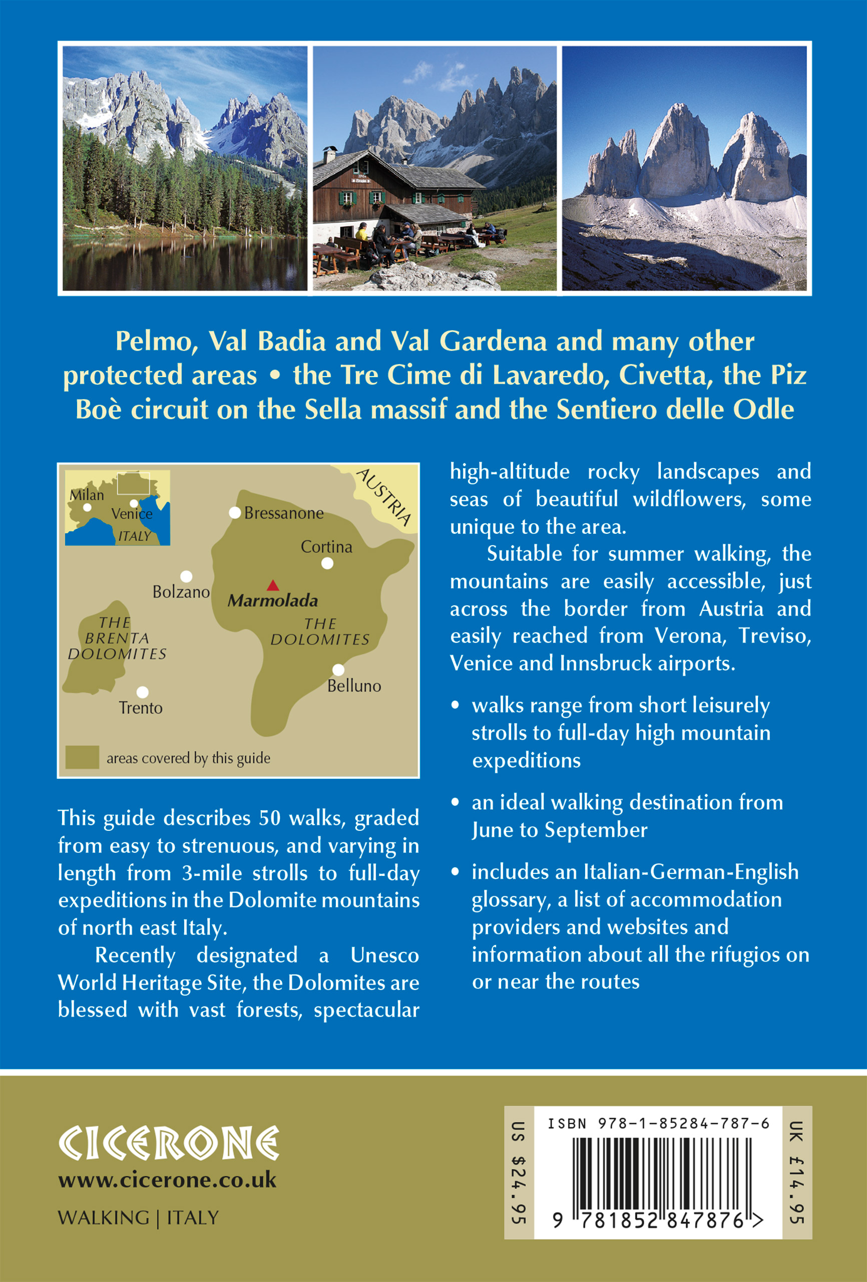 A popular guidebook to short walks in the Dolomites of north east Italy. The guide describes 50 walks, graded from easy to strenuous, and varying in length from 5 km strolls to 20km full-day expeditions. The Dolomites are suitable for summer walking, and the mountains are easily accessible, just across the border from Austria and easily reached from Verona, Treviso, Venice and Innsbruck airports.