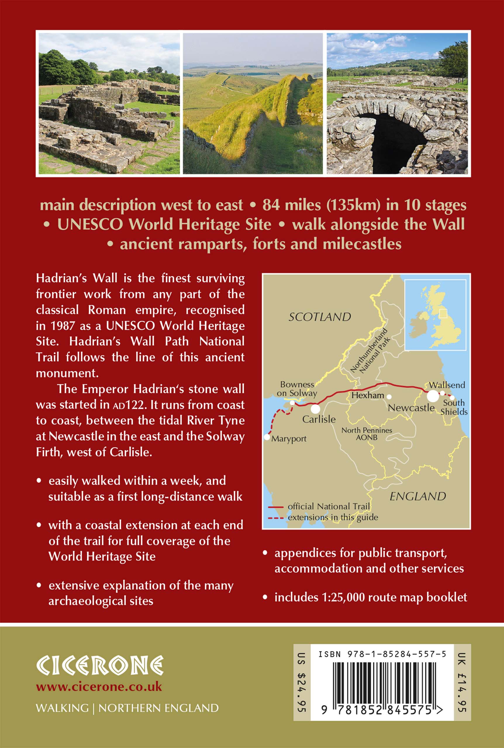 This full-colour guidebook contains a wealth of information on the history of the Wall, and a range of practical information for walkers, from accommodation and itinerary planning, to details on public transport and refreshments. A separate map booklet of 1:25,000 scale OS maps shows the full route. Clear step-by-step route descriptions in the guide are illustrated by 1:100,000 OS map extracts. The route description links together with the map booklet at each stage along the way, and the compact format is conveniently sized for slipping into a jacket pocket or the top of a rucksack.