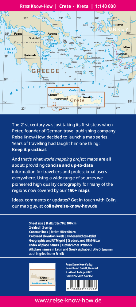 Hochreißfeste und 100% wasserfeste Landkarte "Kreta" aus der Serie world mapping project, erschienen im Reise Know-How Verlag.Reise Know-How Landkarten zeichnen sich durch besonders stabiles Kunststoffpapier aus, das beschreibbar ist wie Papier, sogar mit Bleistift. Der Pappumschlag ist abnehmbar, so dass sich die Karte bequem in jede Tasche stecken lässt. Eine Schutzhülle ist nicht erforderlich. Die kartografische Darstellung konzentriert sich auf die wichtigsten Informationen für Reisende und ist besonders gut lesbar. Statt einer Schummerung werden farbige Höhenschichten verwendet.Ausstattung: - Höhenlinien mit Höhenangaben; - Farbige Höhenschichten; - Klassifiziertes Straßennetz mit Entfernungsangaben; - Sehenswürdigkeiten; - Ausführlicher Ortsindex; - GPS-genau; - Längen- und Breitengrade; - UTM-Gitter; - Fünfsprachige Legende (deutsch, englisch, französisch, spanisch, russisch); - Alle Ortsnamen auch in griechischer Schrift; - Überblickskarte auf dem Umschlag. Handliches Format: 70x100 cm, 2-seitig bedruckt. NEU: Diese Karte enthält - als Hilfe bei der Reiseplanung - Fotos von wichtigen Sehenswürdigkeiten inklusive Angabe des Planquadrats, in dem der entsprechende Ort liegt.Sprachen: Englisch, Französisch, Deutsch, Spanisch, Russisch