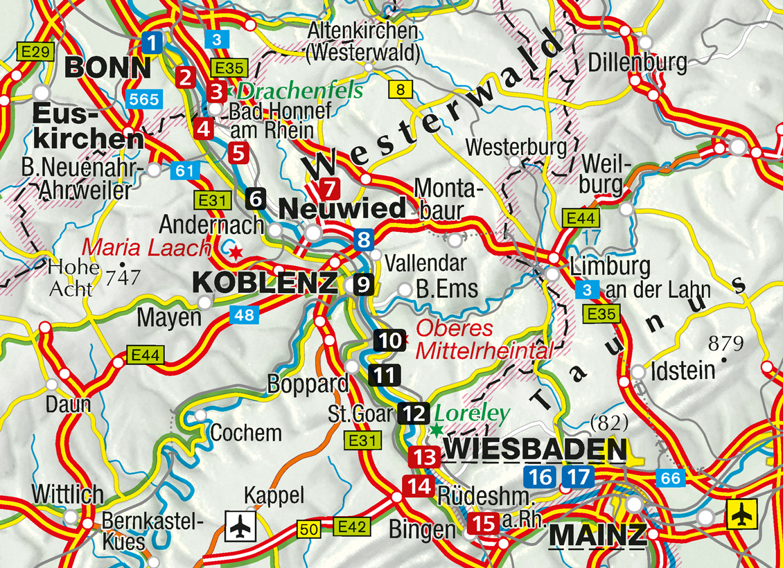 Landschaften: Siebengebirge, Rheinisches Schiefergebirge, Taunus, Rheingau.