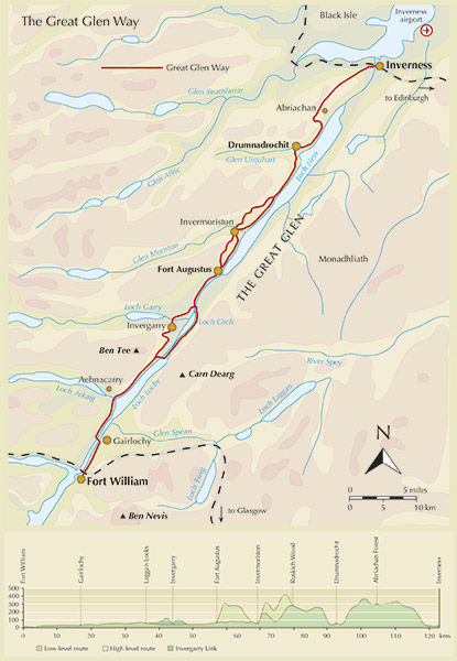 The route is described in both directions in 6 stages of between 12 and 31km (8–19 miles), with both low and high-level options for the central stages. Also included is an alternative route along the north shore of Loch Oich via Invergarry.