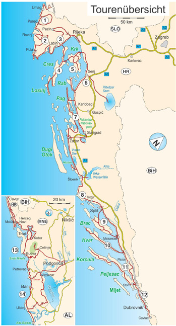 Über 3500 km Kroatien und Montenegro in 14 Touren (rot markiert) zu den bekanntesten und vielen unbekannten Sehenswürdigkeiten. Genaue Markierung vieler Stell-, Bade-, Picknick- und Wanderparkplätze, Toiletten, Ver-und Entsorgungsstationen, Trinkwasserstellen sowie der schönsten Campingplätze.