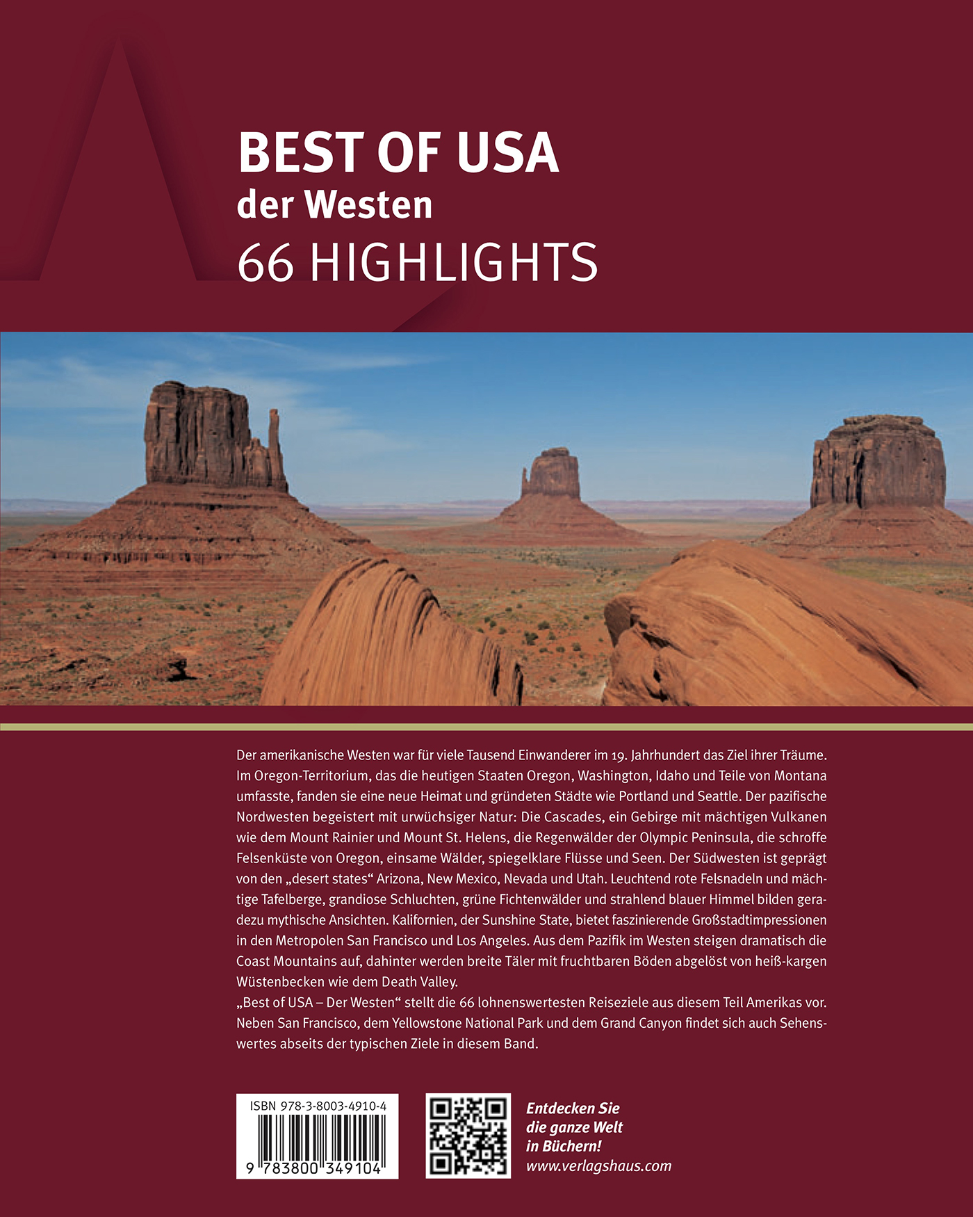 Der amerikanische Westen war für viele Tausend Einwanderer im 19. Jahrhundert das Ziel ihrer Träume. Im Oregon-Territorium, das die heutigen Staaten Oregon, Washington, Idaho und Teile von Montana umfasste, fanden sie eine neue Heimat und gründeten Städte wie Portland und Seattle. Der pazifische Nordwesten begeistert mit urwüchsiger Natur: Die Cascades, ein Gebirge mit mächtigen Vulkanen wie dem Mount Rainier und dem Mount St. Helens, die Regenwälder der Olympic Peninsula, die schroffe Felsenküste von Oregon, einsame Wälder, spiegelklare Flüsse und Seen machen das Gebiet zu einem Paradies, das im 21. Jahrhundert selbst bei vielen Amerikanern noch als Geheimtipp gilt. Der Südwesten ist geprägt von den desert states Arizona, New Mexico, Nevada und Utah, die empty landscapes ziehen Reisende und Künstler gleichermaßen an. Leuchtend rote Felsnadeln und mächtige Tafelberge, grandiose Schluchten, grüne Fichtenwälder und strahlend blauer Himmel bilden geradezu mythische Ansichten. Kalifornien, der Sunshine State, bietet faszinierende Großstadtimpressionen in den Metropolen San Francisco und Los Angeles. Aus dem Pazifik im Westen steigen dramatisch die Coast Mountains auf, dahinter werden breite Täler mit fruchtbaren Böden abgelöst von heiß-kargen Wüstenbecken wie dem Death Valley. Best of USA Der Westen stellt die 66 lohnenswertesten Reiseziele aus diesem Teil Amerikas vor. Neben Hollywood, dem Yellowstone National Park und dem Grand Canyon findet sich auch Sehenswertes abseits der typischen Ziele in diesem Band.