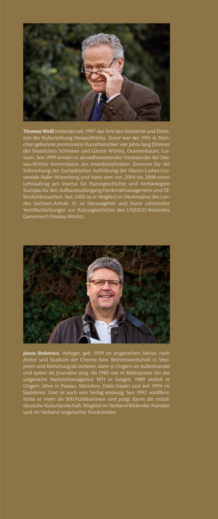 Dr. Thomas Weiss, geb. 1951, war nach dem Studium der Kunstgeschichte, der Klassischen Archäologie und Volkskunde an der Universität München in verschiedenen leitenden Funktionen als Kunsthistoriker tätig. Seit 1994 ist er Direktor der Staatlichen Schlösser und Gärten Wörlitz, Oranienbaum und Luisium, 1997 wurde er zum Direktor und Vorstand der Kulturstiftung Dessau-Wörlitz berufen.