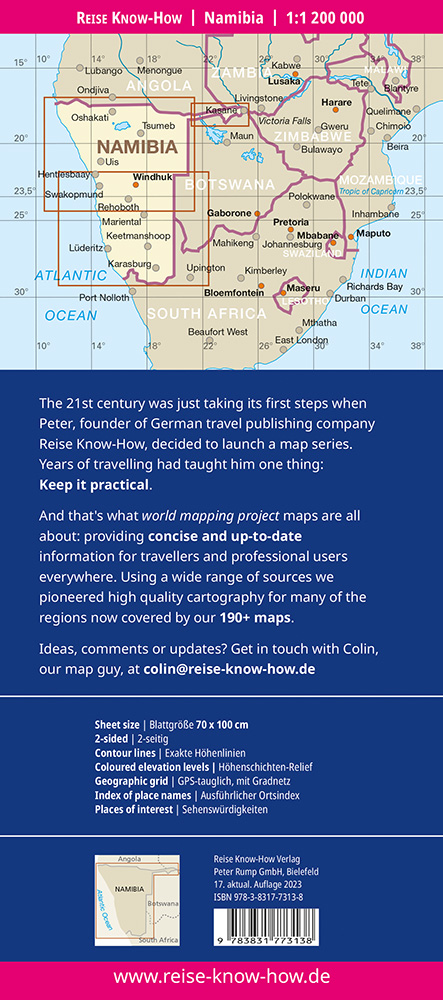| Schlagworte | 2020 • 2023 • Afrika • Autokarte • Caprivi • GPS • Herero • Himba • Landkarte • map • Namib • Namibia • Namibia, Karte • Namibia; Karten • Safari • Straßenkarte • Südafrika • Südliches Afrika • Südwestafrika • wasserfest • Windhoek • Windhuk |