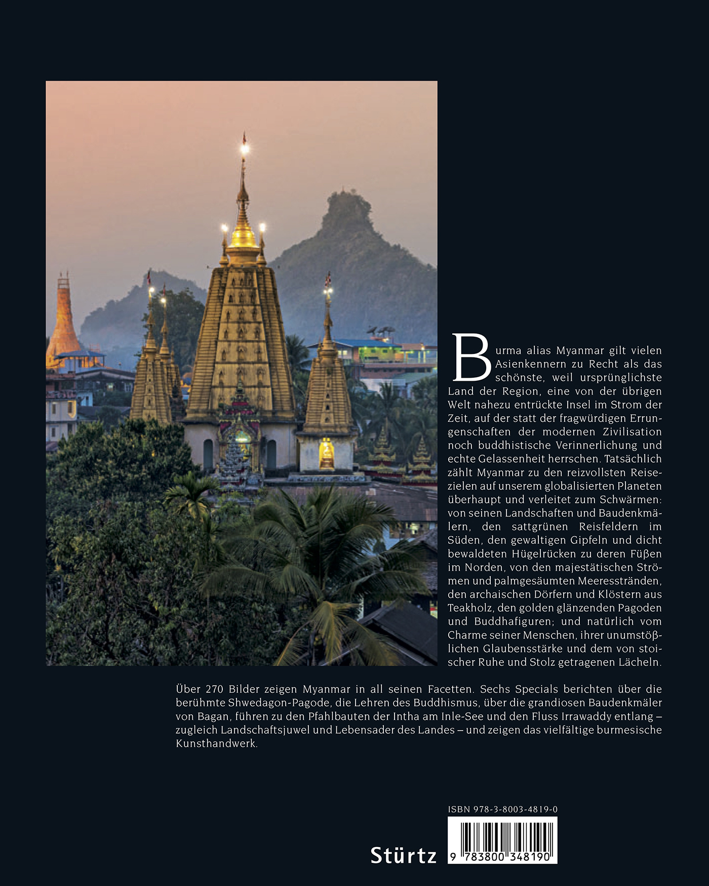 Sattgrüne Reisfelder im Süden, gewaltige Gipfel und dicht bewaldete Hügelrücken im Norden, majestätische Ströme, malerische Seen und palmengesäumte Meeresstrände am Indischen Ozean und der Andamanensee, üppiger tropischer Regenwald, aber auch karge Steppengebiete - das geheimnisvolle Burma lockt mit faszinierender landschaftlicher Vielfalt. Zahlreiche Zeugnisse der bedeutenden und wechselvollen Geschichte ziehen den Besucher des immer noch fremd erscheinenden Landes in seinen Bann. Mit den archaischen Dörfern und Klöstern aus Teakholz, den golden glänzenden Pagoden und Buddhafiguren erscheint Myanmar als eine Insel der Idylle im Strom der Zeit. Hier kann man trotz der oft harten Gegenwart noch das "magische" Südostasien eines Joseph Conrad oder Rudyard Kipling finden, begegnet dem Charme der Menschen mit ihrer unumstößlichen Glaubensstärke und dem von stoischer Ruhe und Stolz getragenem Lächeln.