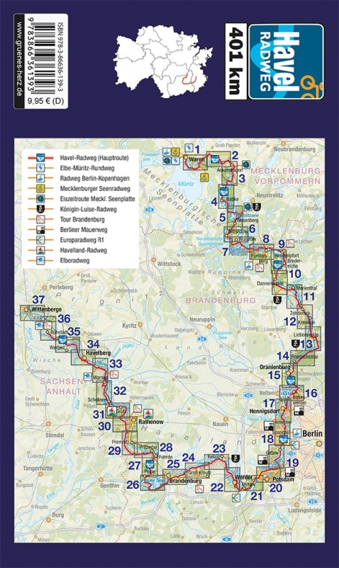 Von der Quelle bei Ankershagen bis zur Mündung in Gnevsdorf ist der Havelradweg 371 km lang. Er führt durch die Bundesländer Mecklenburg-Vorpommern, Brandenburg, Berlin und Sachsen-Anhalt. Die reizvolle und vielfältige Landschaft ist als Nationalpark, Naturpark oder Naturschutzgebiet geschützt. Die Städte Heilbad Waren/Müritz, Fürstenberg/Havel, Zehdenick, Oranienburg, Berlin, Potsdam, Havelberg, Brandenburg und Wittenberge sorgen für kulturelle Abwechslung.Der Radwanderführer teilt die 432 Kilometer lange Strecke (mit An- und Abreise) in sechs Etappen ein. Die 37 Karten-blätter im Maßstab 1:50.000 geben sowohl den Routenverlauf der aus¬geschilderten Hauptroute als auch der empfehlenswerten Nebenrouten und Abstecher detailliert wieder. Besonders beliebt bei Nutzern: die Oberflächenqualität ist in drei Kategorien eingeteilt. Jede Etappe ist ausführlich beschrieben, so dass man schon im Vorfeld einen Eindruck von der Wegbeschaffenheit und dem Schwierigkeitsgrad erhält. Neben der Streckenbeschreibung gibt es Informationen zur Geschichte der angrenzenden Orte und Naturdenkmale. Auf allen Seiten findet man leicht die in der Marginalspalte hervorgehobenen Adressen und Telefonnummern der Touristinformationen. Die praktische Spiralbindung macht den gut handhabbaren Reiseführer zum unentbehrlichen Begleiter für eine Radtour durch Deutschlands mittleren Osten.