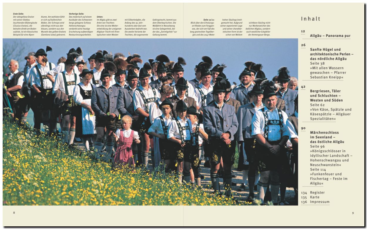Über 200 Bilder zeigen das Allgäu in all seinen Facetten. Vier Specials berichten über die Königsschlösser Hohenschwangau und Neuschwanstein, über die traditionellen Feste, vom Leben und der Lehre des Pfarrers Sebastian Kneipp und über die Allgäuer Spezialitäten – von Käsespätzle bis Nonnenfürzle.