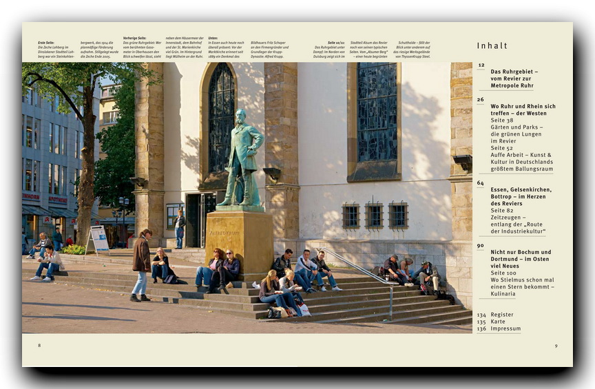 Über 200 Bilder zeigen das Ruhrgebiet in all seinen Facetten. Specials berichten über die grünen Lungen im Revier, Kunst und Kultur, die Zeitzeugen entlang der "Route der Industriekultur" und die Spezialitäten der Ruhrgebietsküche.
