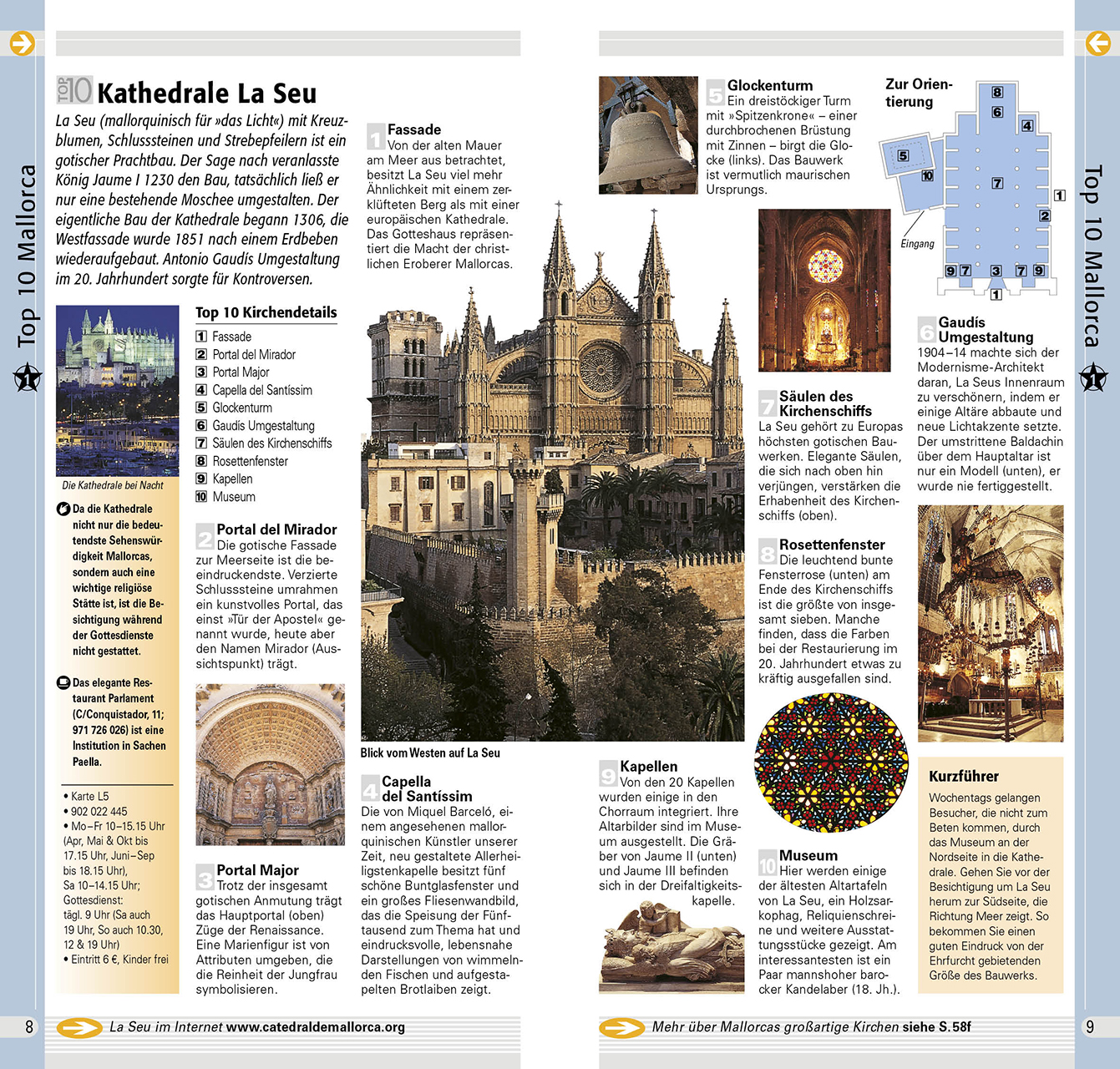 Highlights: Wer nur kurz auf der Insel ist, aber unbedingt die wichtigsten Sehenswürdigkeiten kennenlernen möchte, ist in der Rubrik Mallorcas Highlights genau richtig. Hier wird der Leser auf direktem Weg zu den zehn Highlights dieser bezaubernden Insel geführt, die jeweils auf einer Doppelseite ausführlich vorgestellt werden: von der Kathedrale La Seu in Palma über Valldemossa bis zu Coves del Drac.