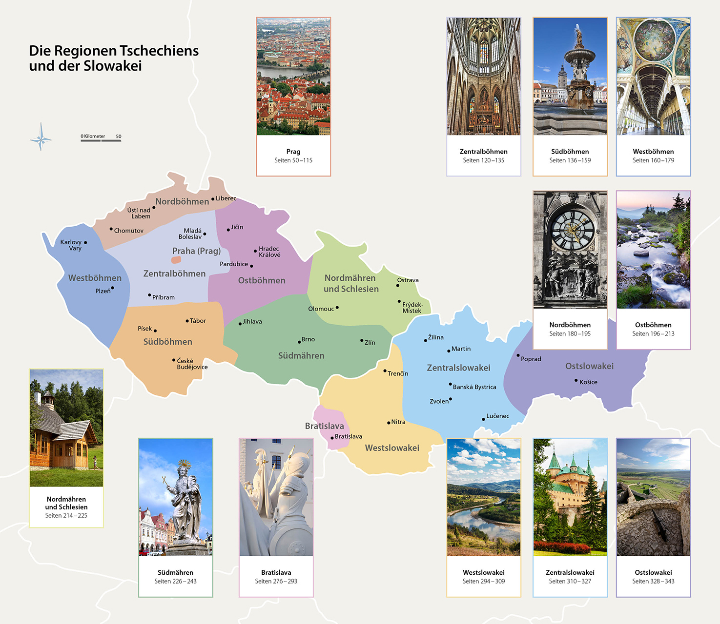 Tschechien stellt sich vor:Tschechien entdecken Tschechien auf der Karte Ein Porträt Tschechiens Das Jahr in Tschechien Die Geschichte TschechiensPrag:Prag im Überblick Hradschin und Kleinseite Altstadt und Josefstadt NeustadtAbstecher Stadtplan Tschechien:Tschechien im Überblick Zentralböhmen Südböhmen Westböhmen Nordböhmen Ostböhmen Nordmähren und Schlesien Südmähren Die Slowakei stellt sich vor:Die Slowakei entdecken Die Slowakei auf der Karte Ein Porträt der Slowakei Das Jahr in der Slowakei Die Geschichte der Slowakei Slowakei:Die Slowakei im Überblick Bratislava WestslowakeiZentralslowakei Ostslowakei Zu Gast in Tschechien und der Slowakei:HotelsRestaurants Shopping Unterhaltung Sport und Aktivurlaub Grundinformationen:Praktische Hinweise Reiseinformationen Textregister Sprachführer