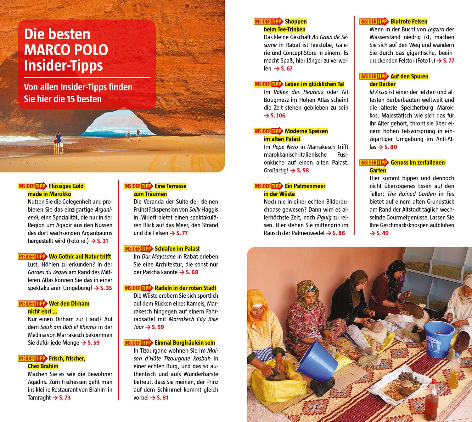 Entdecken Sie mit MARCO POLO Marokko intensiv von den Stränden am Atlantik bis zur Wüsten- und Bergwelt im Landesinneren - mit dem MARCO POLO Reiseführer kommen Sie sofort in Marokko an. Erfahren Sie, welche Highlights Sie neben Marrakechs berühmtem Platz Djemaa El Fna und dem einzigartigen Charme der Medina von Essaouira nicht verpassen dürfen, dass Sie im kleinen Hotel Dar Jnan Tiouira in der Dadesschlucht in einer nach traditionellen Plänen im Lehmbau errichteten Kasbah zu Gast sind und dass Sie dem hippen Marrakech im aufstrebendem Stadtteil Sidi Ghanem nachspüren können. Die Insider-Tipps der Autorin lassen Sie Marokko individuell und authentisch erleben und mit den Low-Budget-Tipps sparen Sie bares Geld. Erkunden Sie Marokko in all seinen Facetten mit den maßgeschneiderten MARCO POLO Erlebnistouren. Das speziell dafür entwickelte Design sorgt - schon beim Lesen und umso mehr vor Ort - für größtmögliche Orientierung. Die kostenlose Touren-App führt Sie digital (und ohne Roaminggebühren) auf den besonderen Wegen der Erlebnistouren.