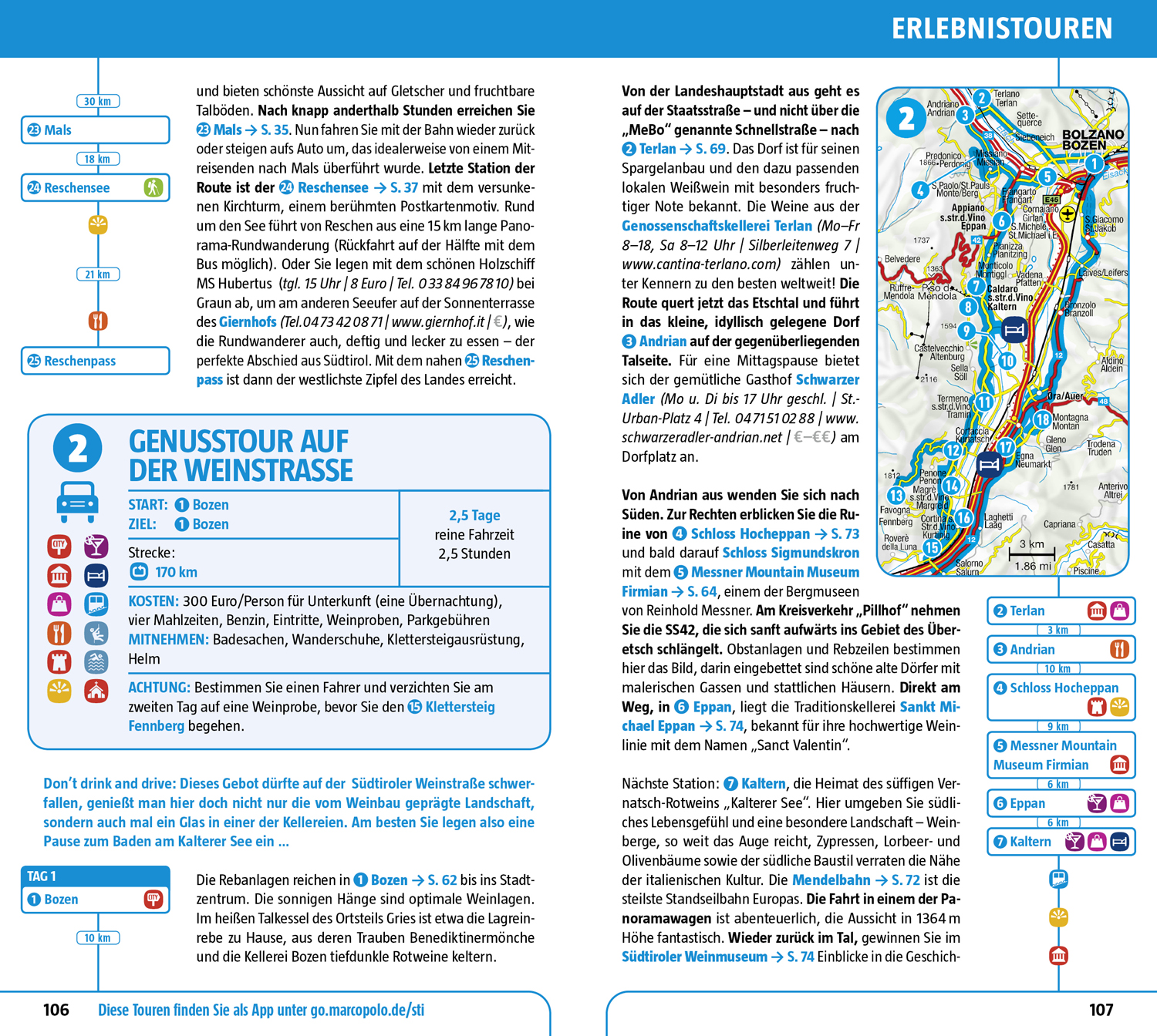 Kompakte Informationen, Insider-Tipps, Erlebnistouren und digitale Extras: Entdecken Sie mit MARCO POLO Südtirol vom Ortlermassiv im Westen bis zu den Sextner Dolomiten im Osten - mit dem MARCO POLO Reiseführer kommen Sie sofort in Südtirol an. Erfahren Sie, welche Highlights Sie neben der Gletschermumie "Ötzi" in Bozen und der traumhaften Naturkulisse der Seiser Alm nicht verpassen dürfen, was es mit dem "Knottnkino" auf sich hat, das der Künstler Franz Messner auf einem Berggipfel überm Etschtal installiert hat, und warum die Kletterhalle in Bozen für Anfänger und Profis bei jedem Wetter eine Attraktion ist. Die Insider-Tipps der Autoren lassen Sie Südtirol individuell und authentisch erleben und mit den Low-Budget-Tipps sparen Sie bares Geld. Erkunden Sie Südtirol in all seinen Facetten mit den maßgeschneiderten MARCO POLO Erlebnistouren. Das speziell dafür entwickelte Design sorgt - schon beim Lesen und umso mehr vor Ort - für größtmögliche Orientierung. Die kostenlose Touren-App führt Sie digital (und ohne Roaminggebühren) auf den besonderen Wegen der Erlebnistouren.