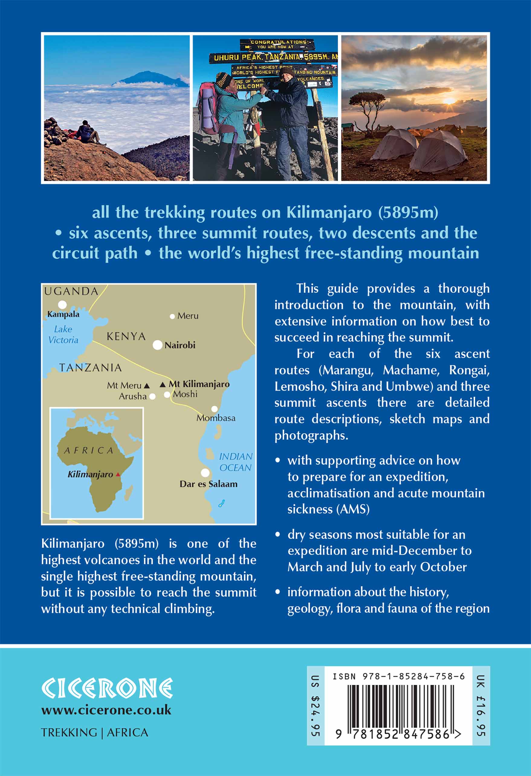 The guidebook covers the six ascent routes (Marangu, Machame, Rongai, Lemosho, Shira and Umbwe), three summit ascents, two descent routes and the circuit path. A full expedition can be completed in 4–7 days, although more generous itineraries are recommended to allow for acclimatisation. Also included in the guidebook is an ascent of neighbouring Mount Meru, which could be used as an acclimatisation trek.