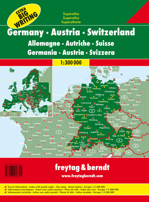 Extra große Schrift, Touristische Informationen, Ortsregister mit Postleitzahlen, Citypläne, Straßenverzeichnis, Europa 1:3.500.000;