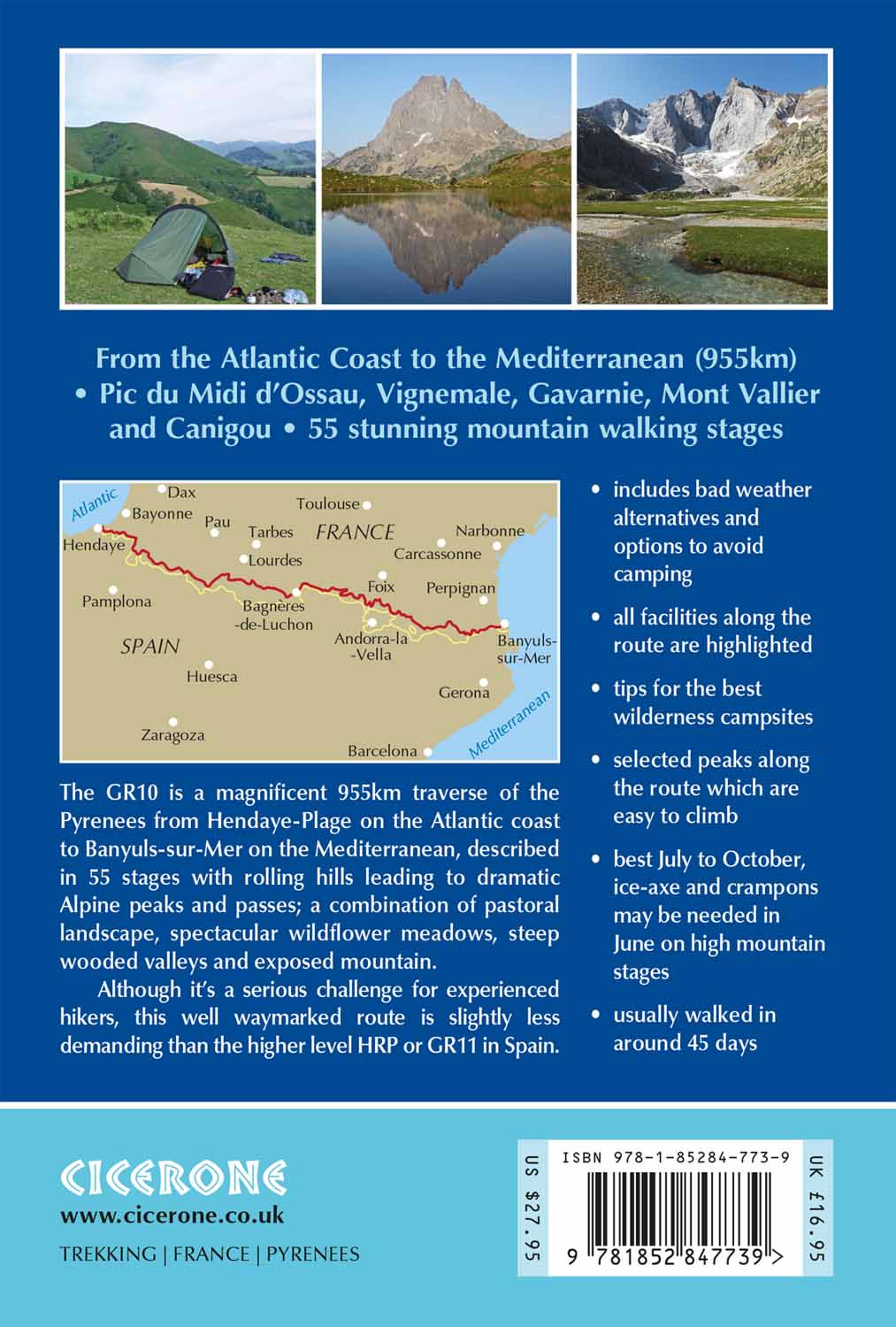 Guidebook to the GR10, a 955km trek across the French Pyrenees from Hendaye on the Atlantic Coast to the Mediterranean coast at Banyuls-sur-Mer. Described in 55-day stages of 7-27km, the route can be completed in its entirety, usually in around 45 days, or in shorter sections using the bus and rail links found throughout the Pyrenees.