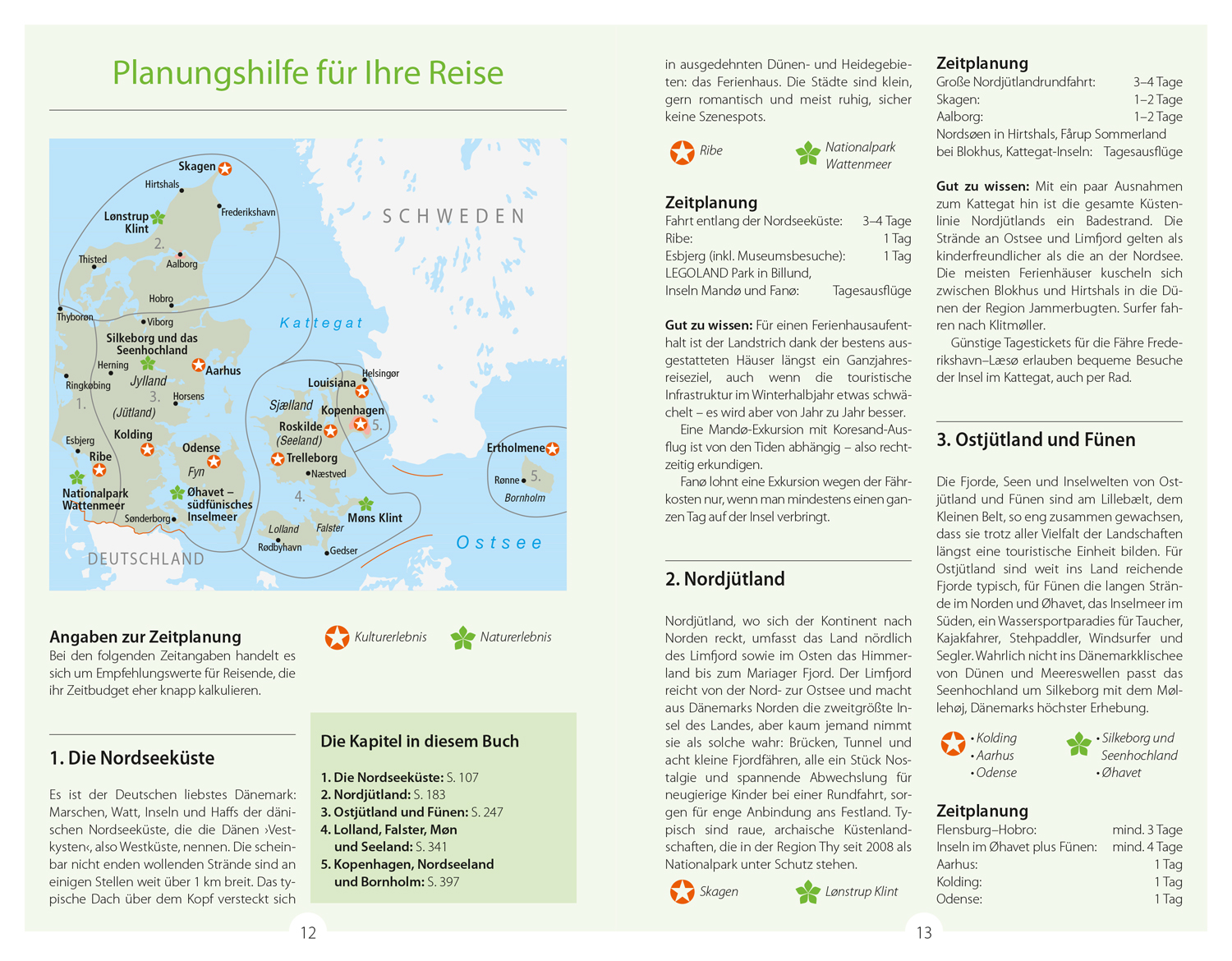 Wissenswertes über Dänemark, Wissenswertes für die Reise, Kulinarisches Lexikon, Sprachführer, die Nordseeküste mit Rømø, Nordjütland, Ostjütland und Fünen, Lolland, Falster, Møn und Seeland, Kopenhagen, Nordseeland und Bornholm, 27 Karten und Pläne plus eine separate Dänemark-Reisekarte im Maßstab 1:450.000.