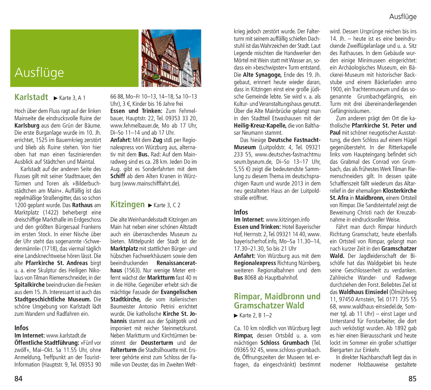 Im großen separaten Cityplan sind alle im Buch empfohlenen Adressen namentlich eingetragen, zudem gibt es einen Extraplan der Innenstadt, eine Umgebungskarte sowie einen Netzplan der Würzburger Verkehrsbetriebe. Die Übersichtskarte zeigt alle Highlights, Detailpläne erlauben die präzise Orientierung in den 15 "Direkt-Kapiteln".