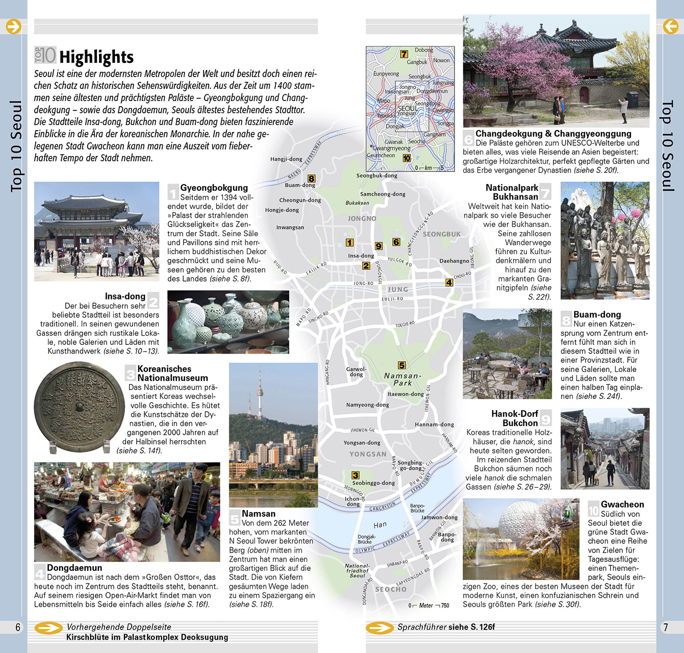 Highlights: Wer nur kurz in der Stadt ist, aber unbedingt die wichtigsten Sehenswürdigkeiten kennenlernen möchte, ist in der Rubrik Seouls Highlights genau richtig. Hier wird der Leser auf direktem Weg zu den zehn Highlights dieser faszinierenden Stadt geführt, die jeweils auf einer Doppelseite ausführlich vorgestellt werden: vom Koreanisches Nationalmuseum bis zum Nationalpark Bukhansan und dem Hanok-Dorf Bukchon.