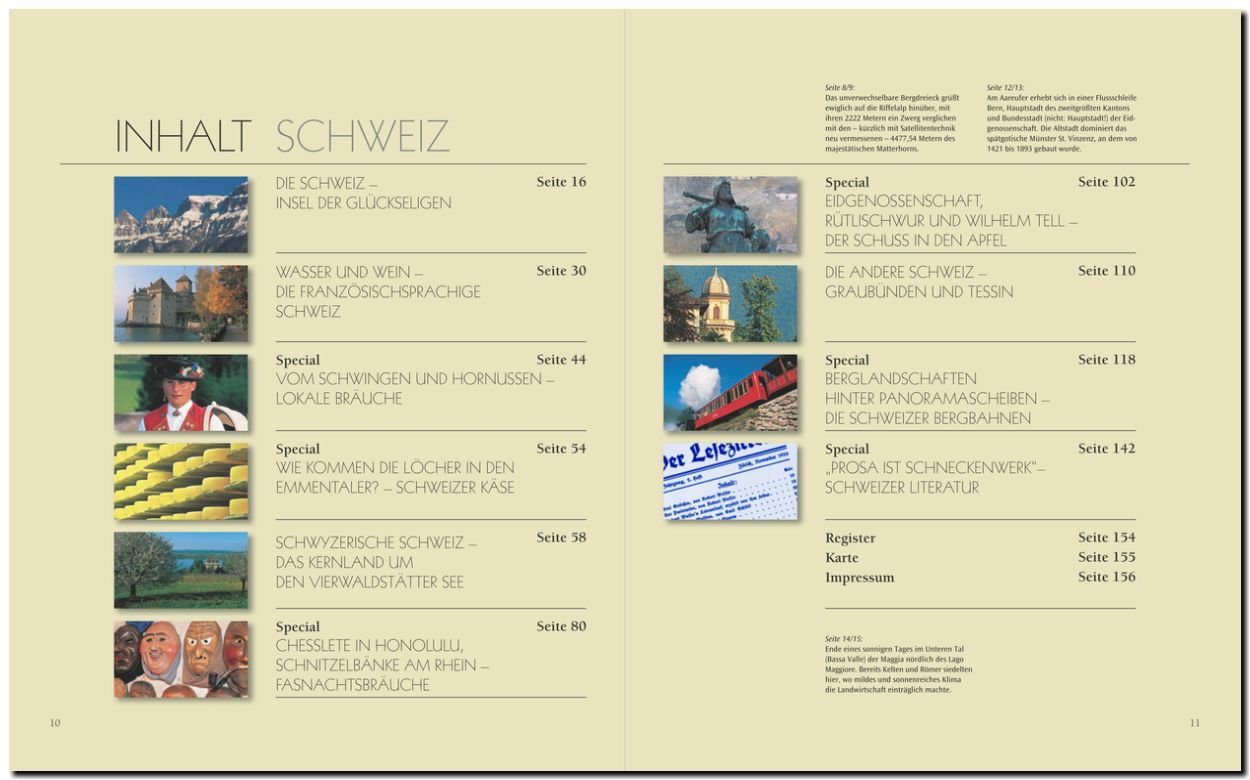 Über 250 Bilder zeigen die Schweiz in ihrer Vielfalt, sechs Specials berichten über traditionelle Bräuche, das Rätsel der Löcher im Käse, die Schweizer Fasnacht und den Rütlischwur, sowie die Schweizer Bergbahnen und Schriftsteller des Landes.