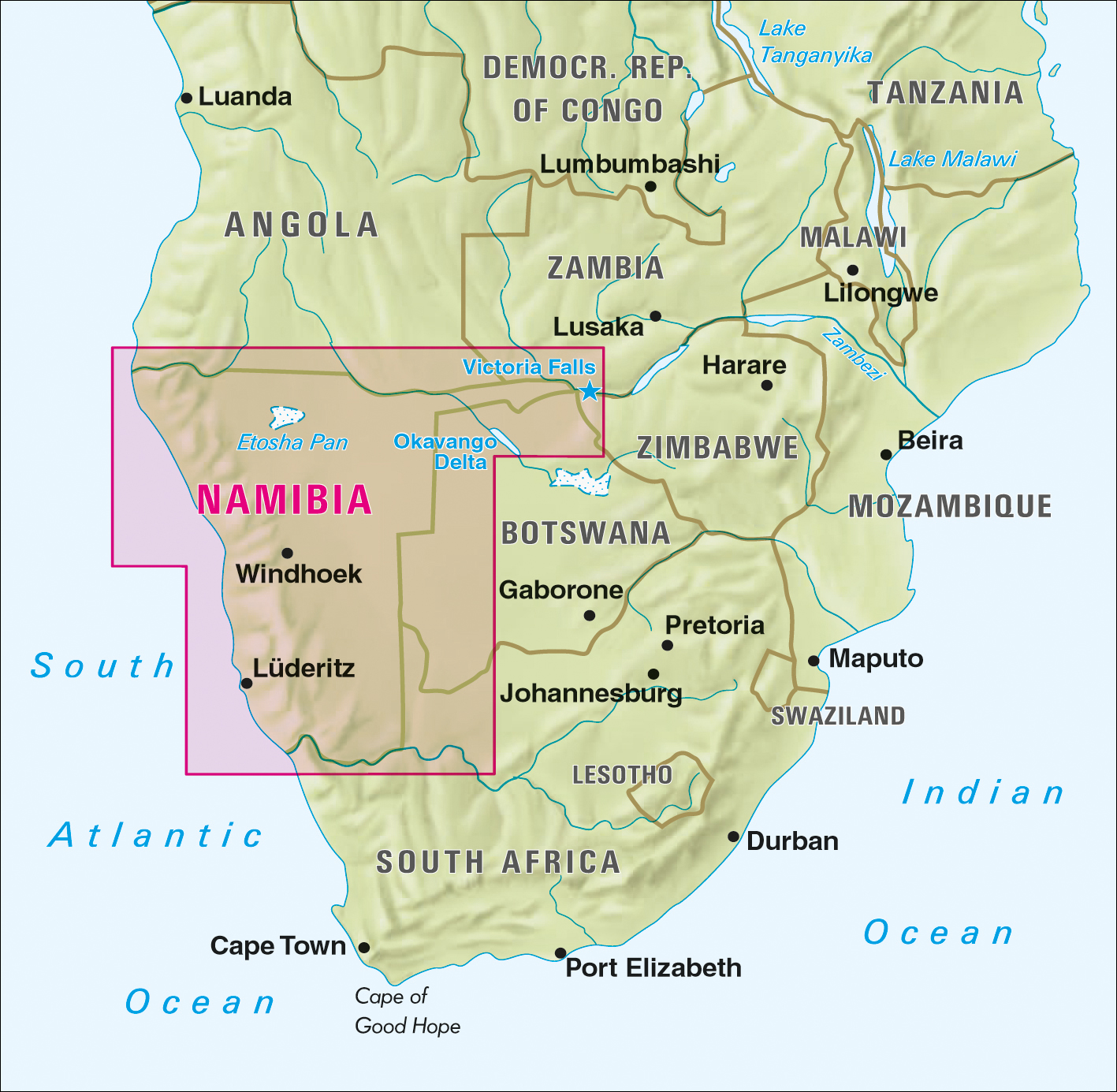 | Schlagworte | Botswana, Karte • Botswana; Karten • Fish River Canyon • Keetmanshoop • Lüderitz • Maun • Namibia • Namibia, Karte • Namibia; Karten • Okahandja • reiß- und wasserfest • Sossusvlei • Straßenkarten und Stadtpläne • Südafrika • Südliches Afrika • Swakopmund • Tsumeb • Victoria Falls • Viktoriafälle • Walvis Bay • Waterberg • waterproof and tear-resistant • Windhoek |