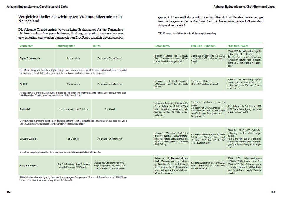 Als Dach der Sternenhimmel ein Ratgeber voller Fakten und Tipps rund um das Wohnmobil-Reisen in Neuseeland. Die wichtigsten Fragen vor einer Neuseeland-Reise werden beantwortet: Wo finde ich ein Wohnmobil, das genau meinen Bedürfnissen entspricht? Wie kaufe ich einen gebrauchten Campervan? Wie schwierig ist das Fahren in Neuseeland? Was sind die schönsten Routen? Wie sehen die neuseeländischen Campingplätze aus? Ist Freedom Camping in Neuseeland (noch) erlaubt? Was muss ich für einen Wohnmobil-Urlaub einpacken? In einem Special werden zudem die besonderen Anliegen und Fragen von Familien mit (kleinen) Kindern mit viel persönlicher Erfahrung beantwortet. Zahlreiche praktische Checklisten zum Kopieren, Tabellen und Web-Links zum Nachschlagen machen das Buch zum unverzichtbaren Reisebegleiter für alle Campervan-Enthusiasten, die das schönste Ende der Welt entdecken wollen. 2. Auflage.