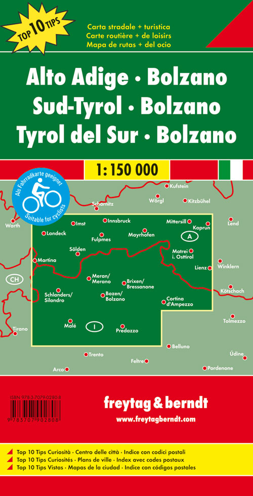 Neben der übersichtlichen Gestaltung verfügt die Straßenkarte "Südtirol - Bozen 1:150.000" über zahlreiche Zusatzinformationen wie z.B. Straßenbeschaffenheit, Sehenswürdigkeiten, Campingplätze und diverse Innenstadtpläne. Mit dem umfangreichen Ortsregister gelingt zudem eine rasche Orientierung. Die "Top 10 Tips" - Reihe bietet ein kleines Beiheft, in dem die zehn wichtigsten Sehenswürdigkeiten in mehreren Sprachen kurz beschrieben sind. (Sprachen: Deutsch, Englisch, Italienisch, Französisch) Citypläne: Bozen/Bolzano, Lienz, Meran/Merano; Top 10 Tips Sehenswürdigkeiten, Ortsregister mit Postleitzahlen, Weitwanderwege, als Fahrradkarte geeignet; freytag & berndt Autokarten sind für viele Länder und Regionen weltweit erhältlich.