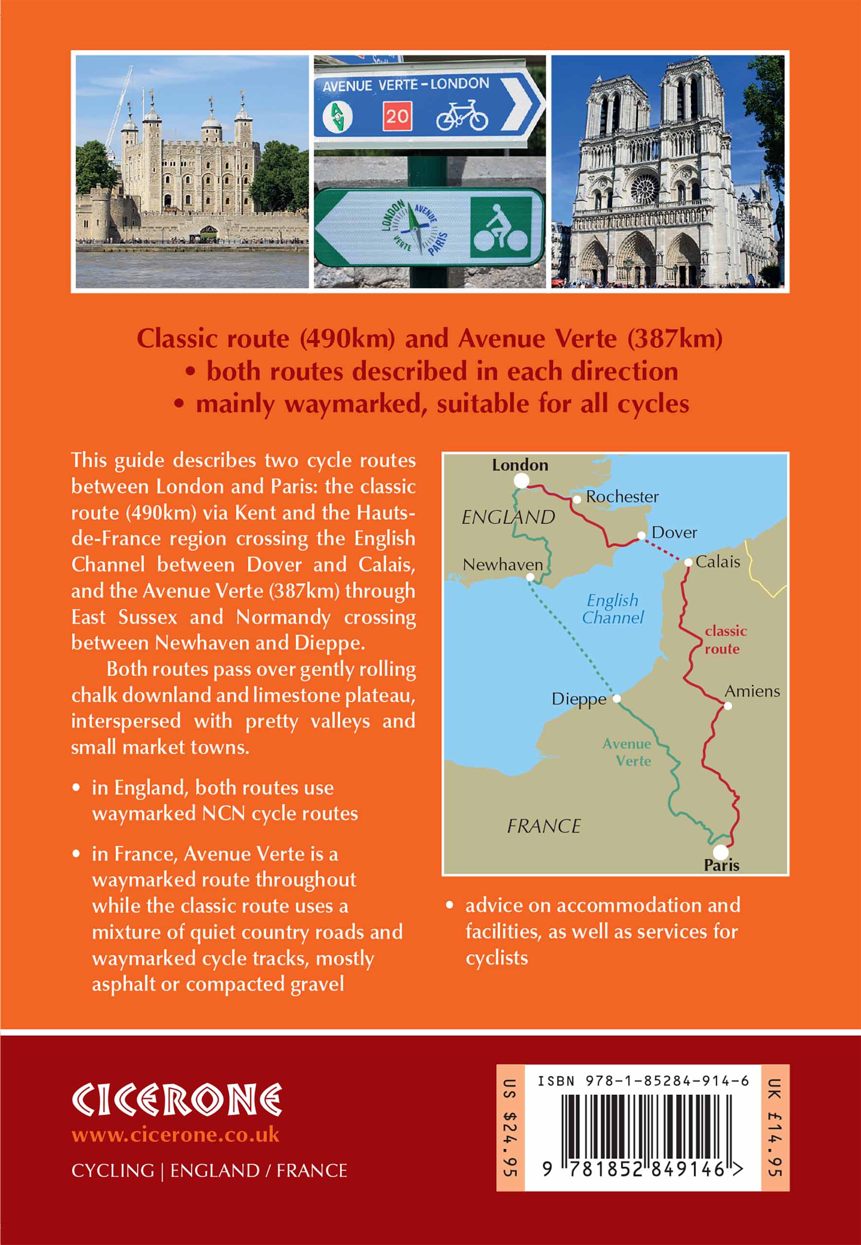 The classic route, via Dover/Calais, is described in 11 stages and the Avenue Verte, via Newhaven/Dieppe, in 9 stages, each between 13 and 63km (8–39 miles) in length. The routes are described north-south but a summary description is also provided for those wanting to cycle in the opposite direction.