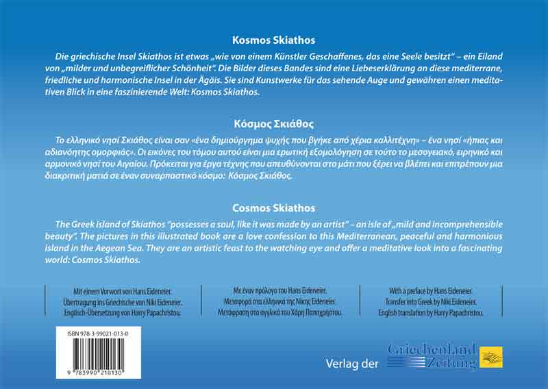 Dr. Dieter Seidel wurde in Augsburg geboren. Schon in frühester Jugend zeigten sich bei ihm Anzeichen einer ausgeprägten Form von „Philhellenie“. Er begeisterte sich für die Kultur der griechischen Antike in allen ihren Ausprägungen. Nach seiner Schul- und Studienzeit bereiste er Griechenland und besuchte die antiken Stätten. Er lernte die griechische Lebensart kennen, schätzen und lieben. Es war eine überaus glückliche Fügung des Schicksals, die ihm die Insel Skiathos zu seiner zweiten Heimat werden ließ. In seinem Gedichtband „Griechische Augenblicke“, ebenfalls im Verlag der Griechenland Zeitung erschienen, gab er einen lyrischen und optischen Einblick in die Folgen dieser frühen Erfahrungen. Mit seinem Bildband „Kosmos Skiathos“ bedankt er sich für diese Erfahrungen und macht seiner Lieblingsinsel Skiathos ein Kompliment.