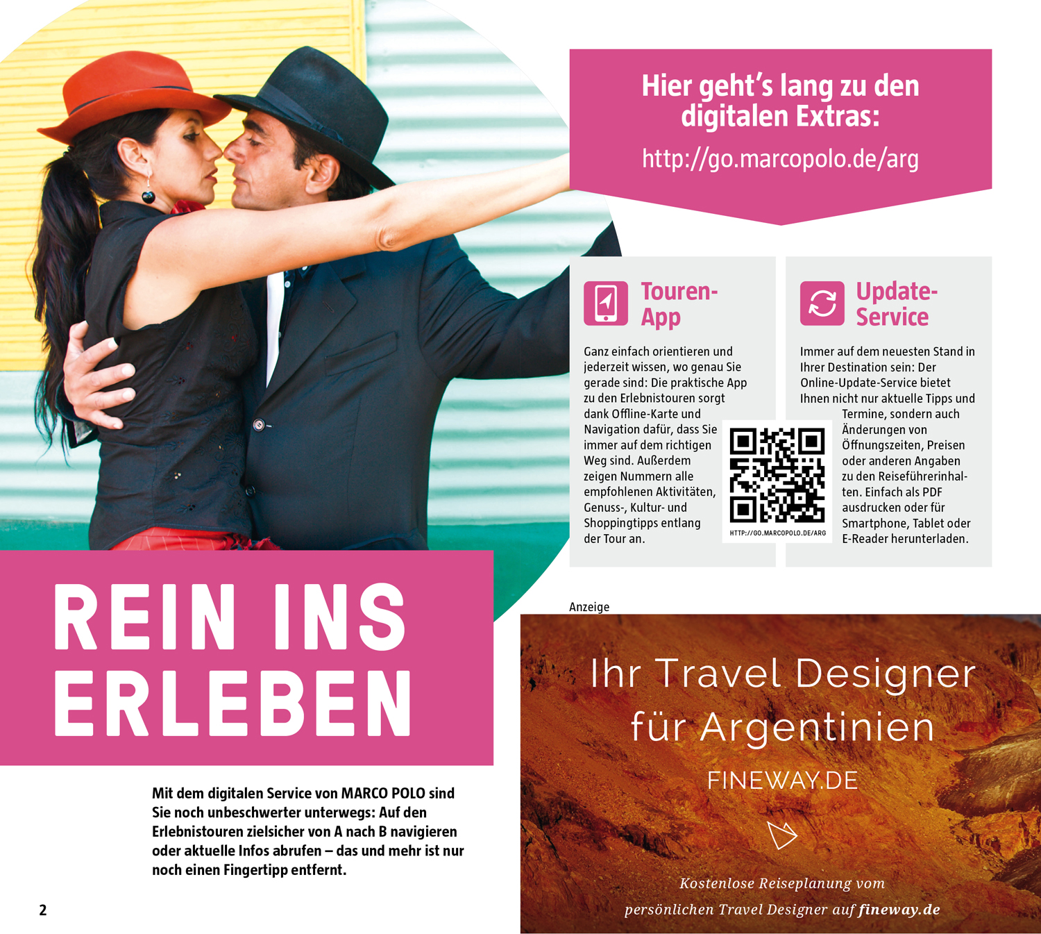 Kompakte Informationen, Insider-Tipps, Erlebnistouren und digitale Extras: Entdecken Sie mit MARCO POLO Argentinien intensiv von den Iguazú-Wasserfällen im tropischen Regenwald bis zur endlosen Weite Patagoniens - mit dem MARCO POLO Reiseführer kommen Sie sofort in Argentinien an. Erfahren Sie, welche Highlights Sie neben dem Tangoviertel San Telmo in Buenos Aires und dem "Zug zu den Wolken" in den Anden nicht verpassen dürfen, wo Sie auf organisierten Flussfahrten Ausflüge zum "Stonehunting" (Achat und andere Halbedelsteine) und zu Wasserschweinen unternehmen und welches die besten Geschäfte in der Hauptstadt sind, um auf Schnäppchenjagd nach Lederartikeln im Land der Gauchos zu gehen. Die Insider-Tipps des Koautors lassen Sie Argentinien individuell und authentisch erleben und mit den Low-Budget-Tipps sparen Sie bares Geld. Erkunden Sie Argentinien in all seinen Facetten mit den maßgeschneiderten MARCO POLO Erlebnistouren. Das speziell dafür entwickelte Design sorgt - schon beim Lesen und umso mehr vor Ort - für größtmögliche Orientierung. Die kostenlose Touren-App führt Sie digital (und ohne Roaminggebühren) auf den besonderen Wegen der Erlebnistouren.