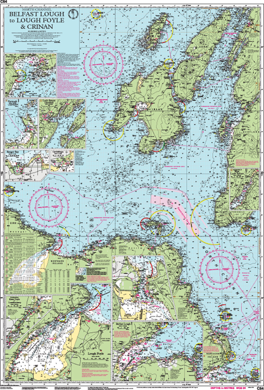 Plans included: Loch Sween (Tayvallich) (1:25 000) Continuation of West Loch Tarbert (1:65 000) Port Ellen (1:25 000) Lough Foyle (1:90 000) Portrush (1:20 000) Larne (1:18 500) Belfast Lough (1:110 000) Carrickfergus (1:15 000) Bangor Bay (1:17 500) Continuation of River Foyle to Londonderry (1:60 000) On this 2016 edition the latest depth surveys have been applied along with general updating throughout.