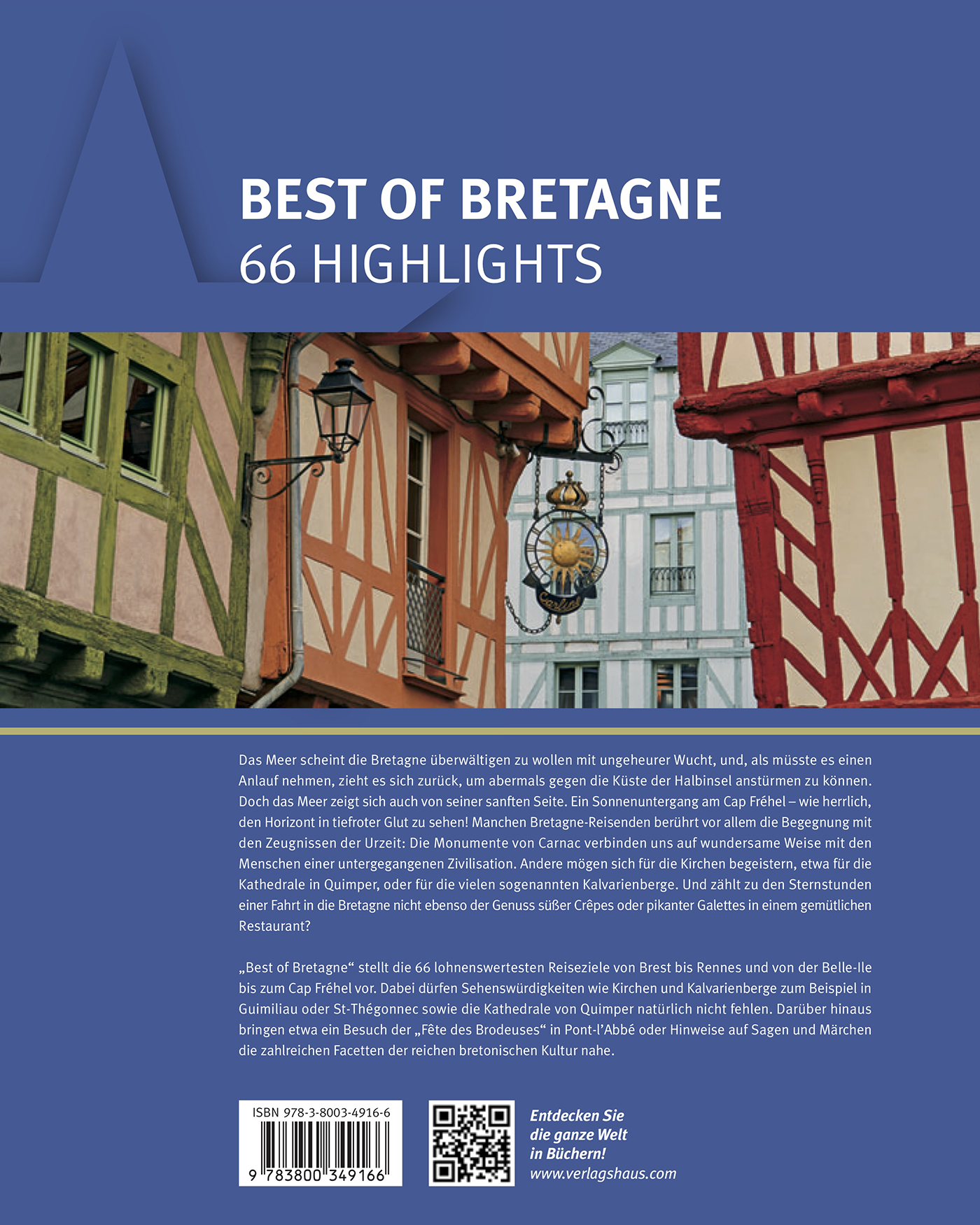 „Best of Bretagne“ stellt die 66 lohnenswertesten Reiseziele von Brest bis Rennes und von der Belle-Île bis zum Cap Fréhel vor. Dabei dürfen Sehenswürdigkeiten wie Kirchen und Kalvarienberge zum Beispiel in Ploumoguer oder die Kathedrale von Quimper natürlich nicht fehlen. Darüber hinaus bringen etwa ein Besuch der „Fête des Brodeuses“ in Pont-l’Abbé oder ein Artikel über Bretonische Sagen und Märchen die zahlreichen Facetten der reichen bretonischen Kultur nahe.