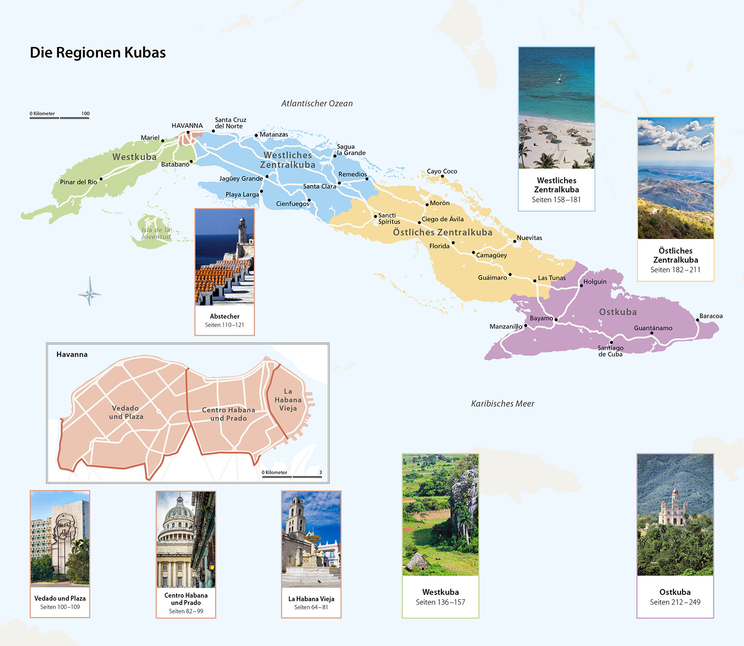 Kuba stellt sich vor:Kuba entdecken Kuba auf der Karte Ein Porträt Kubas Das Jahr in KubaDie Geschichte KubasHavanna:Havanna stellt sich vorLa Habana ViejaCentro Habana und PradoVedado und Plaza Abstecher Stadtplan Unterhaltung Die Regionen Kubas:Kuba im Überblick Westkuba Westliches Zentralkuba Östliches Zentralkuba Ostkuba Zu Gast in Kuba:Hotels Restaurants Shopping Unterhaltung Sport und Aktivurlaub Grundinformationen:Praktische Hinweise Reiseinformationen Textregister Sprachführer