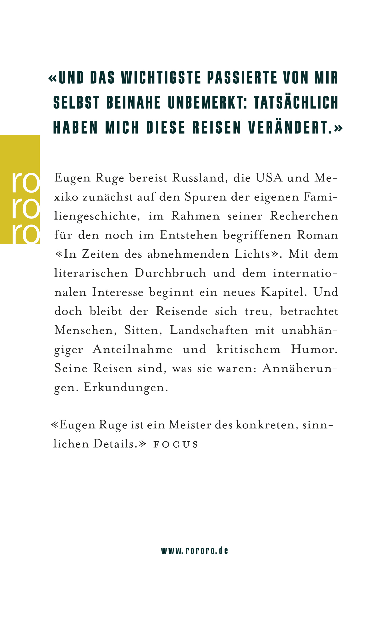 Eugen Ruge bereist Russland und Mexiko, zunächst auf den Spuren der eigenen Familiengeschichte, im Rahmen seiner Recherchen für den noch im Entstehen begriffenen Roman «In Zeiten des abnehmenden Lichts». Mit dem literarischen Durchbruch und dem internationalen Interesse beginnt ein neues Kapitel: Der Autor wird als Gast eingeladen, und der Blick auf die Städte und Länder ist dieser Perspektive entsprechend verändert. Und doch bleibt der Reisende sich treu, er betrachtet Menschen, Sitten, Landschaften mit unabhängiger Anteilnahme und kritischem Humor, nie um ein klares Wort verlegen, aber immer bereit, Erwartungen mit Erfahrungen zu vertauschen.
