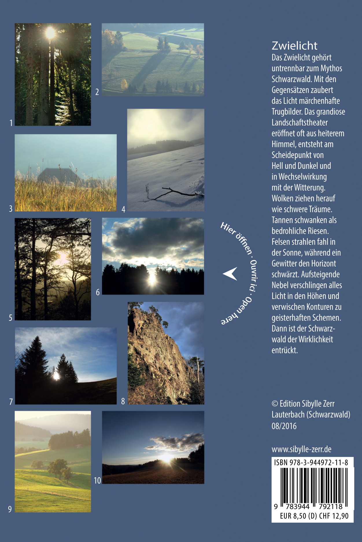 Als Autorin ist Sibylle Zerr weit gereist. Für kostbare lichte Augenblicke hat sie sich hier nun endlich die Landschaft ihrer Kindheit erwandert. Das Ergebnis sind Ansichten von entsprechender Tiefe. En tant qu’auteure, Sibylle Zerr a effectué de nombreux voyages. Afin de recueillir des instants lumineux précieux, elle s’est enfin lancée sur les chemins des paysages de son enfance. Il en résulte des vues dont se dégage une profondeur conséquente. Author Sibylle Zerr is widely travelled. For invaluable bright moments, she hiked through the landscape of her childhood finally. The findings are prospects of considerable depth.