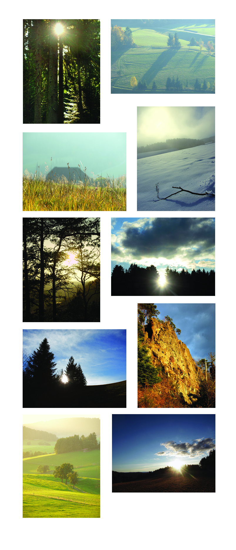 Im Schwarzwald tanzt das Licht unvergleichlich leichtfüßig. Lichtphänomene zeichnen ihn aus: Täler bergen tiefe Schatten. Höhen überfließt gleißende Helle. Die Sonne greift mit Strahlenfingern in die markante Kontur. Deutlich wird der Tageslauf im raschen Wechsel von hell und dunkel. Das Licht verweilt nie lange, wandert übers Land als Sonnenuhr. Wolken reisen als Lichtmeister darüber. Augenblicke bleiben einzigartig. So scheint die Sonne im Tanz zu mahnen, wie kostbar Zeit ist.