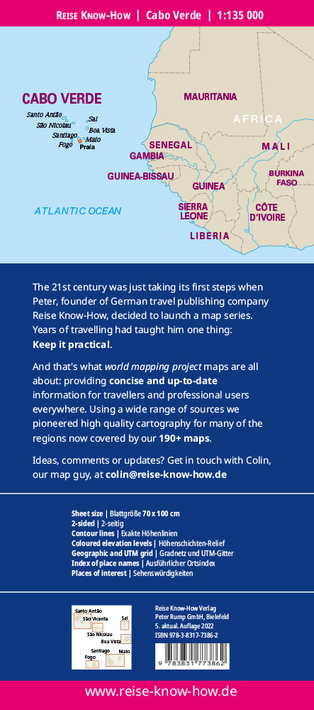 Hochreißfeste und 100% wasserfeste Landkarte "Cabo Verde" aus der Serie world mapping project, erschienen im Reise Know-How Verlag.Reise Know-How Landkarten zeichnen sich durch besonders stabiles Kunststoffpapier aus, das beschreibbar ist wie Papier, sogar mit Bleistift. Der Pappumschlag ist abnehmbar, so dass sich die Karte bequem in jede Tasche stecken lässt. Eine Schutzhülle ist nicht erforderlich. Die kartografische Darstellung konzentriert sich auf die wichtigsten Informationen für Reisende und ist besonders gut lesbar. Statt einer Schummerung werden farbige Höhenschichten verwendet.Ausstattung: - Höhenlinien mit Höhenangaben; - Farbige Höhenschichten; - Klassifiziertes Straßennetz mit Entfernungsangaben; - Sehenswürdigkeiten; - Ausführlicher Ortsindex; - GPS-genau; - Längen- und Breitengrade; - UTM-Gitter; - Viersprachige Legende (deutsch, englisch, französisch, spanisch); - Blattaufteilung: 6 Teilkarten für die Inseln; - 1 Überblickskarte. Handliches Format: 70x100 cm, 2-seitig bedruckt. NEU: Diese Karte enthält - als Hilfe bei der Reiseplanung - Fotos von wichtigen Sehenswürdigkeiten inklusive Angabe des Planquadrats, in dem der entsprechende Ort liegt.Sprachen: Englisch, Französisch, Deutsch, Spanisch, Russisch