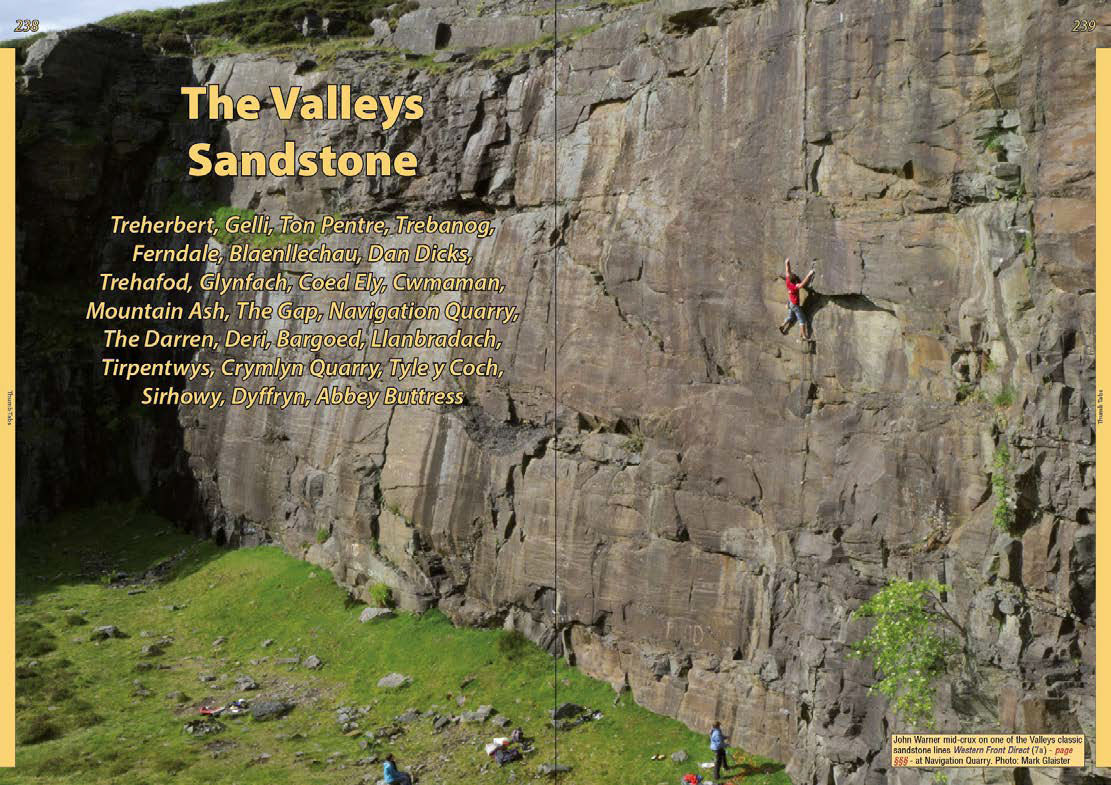 Carmarthenshire - Telpyn Point, Morfa Bychan, Pendine* Gower - Rhossili Area, Third Sister to Paviland, Oxwich, Southgate Area, East and Inland Gower* Inland and Coastal Limestone - Dinas Rock, Taffs Well, Taffs Well West, Gilwern, Witches Point, Temple Bay, Castle Upon Alun* Valleys Sandstone - Treherbert, Gelli, Ton Pentre, Trebanog, Ferndale, Blaenllechau, Dan Dicks, Trehafod, Glynfach, Coed Ely, Cwmaman, Mountain Ash, The Gap, Navigation Quarry, The Darren, Deri, Bargoed, Llanbradach, Tirpentwys, Crymlyn Quarry, Tyle y Coch, Sirhowy, Dyffryn, Abbey Buttress