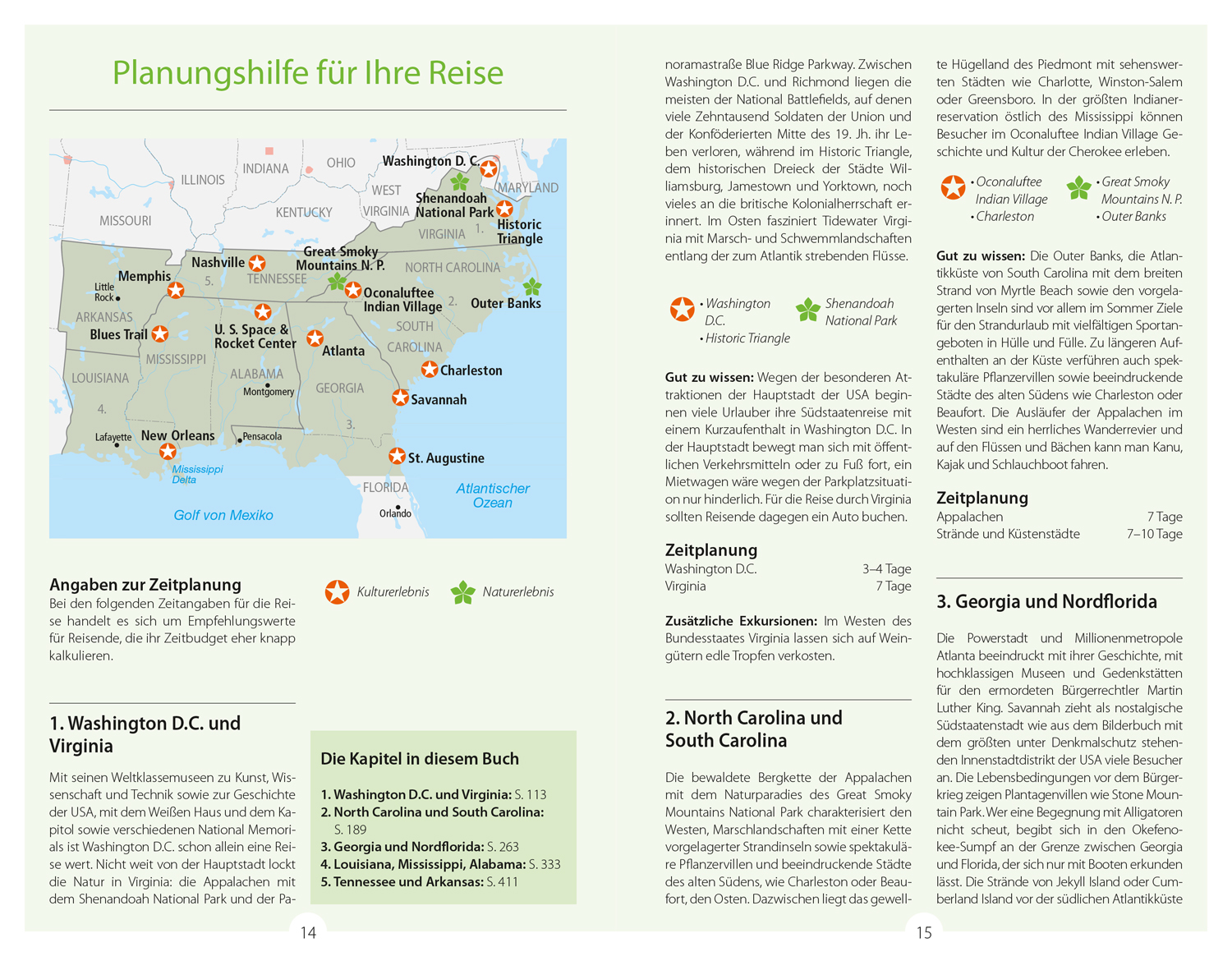 Zu jedem Kapitel präsentiert eine Doppelseite "Auf einen Blick" die Highlights, die schönsten Routen, aktive Naturerlebnisse und besondere Tipps des Autors. Ort für Ort hat Axel Pinck ausgesuchte Unterkünfte, Restaurants oder Einkaufsadressen zusammengestellt, die in den Cityplänen eingezeichnet sind. Wanderungen und Kanutouren erschließen die schönsten Landschaften, etwa den bildschönen Shenandoah National Park oder die ausgedehnte Okefenokee-Sumpflandschaft. Viel Wissenswertes über die Südstaaten der USA, über ihre Geschichte und Gegenwart, den Alltag der Menschen sowie über die lebendige und vielstimmige (Musik)kultur lässt sich in der einführenden Landeskunde wie in den eingestreuten Themenseiten nachlesen.