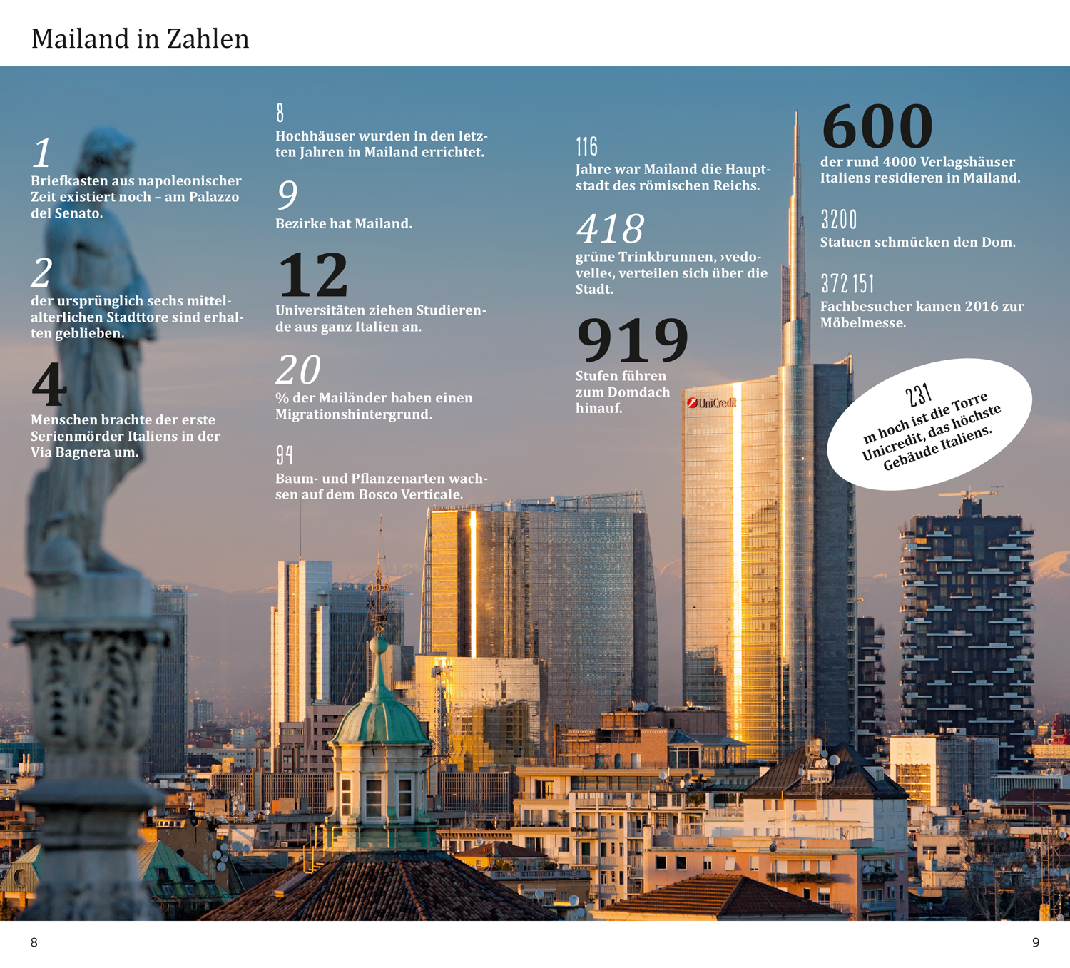 Das Beste zu Beginn. Das ist Mailand. Mailand in Zahlen. Was ist wo? Augenblicke. Ihr Mailand-Kompass. 15 Direktkapitel. Mailands Museumslandschaft. Neue Architektur in Mailand. Skulpturen und Denkmäler. Fabriken in neuer Funktion. Pause – einfach mal abschalten. In fremden Betten. Satt & glücklich. Stöbern & entdecken. Wenn die Nacht beginnt. Hin & weg. O-Ton Mailand. Kennen Sie die?