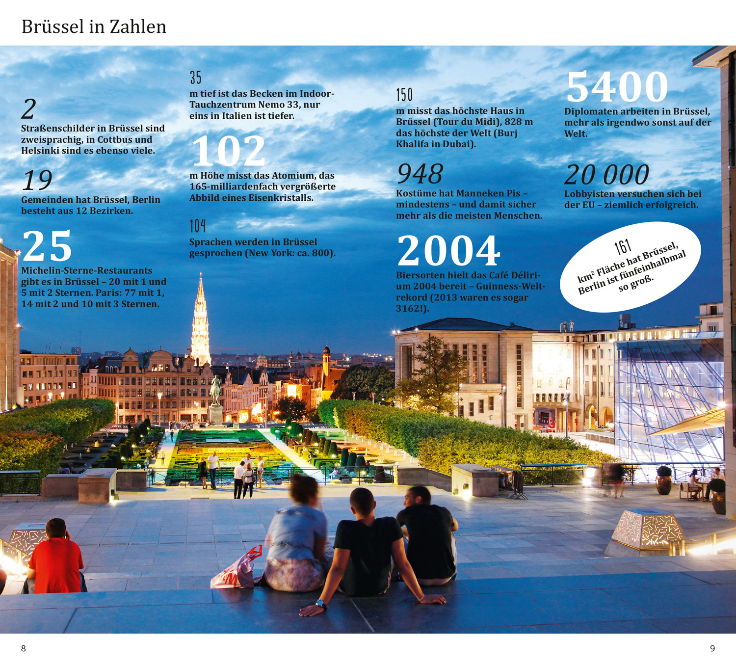 Das Beste zu Beginn. Das ist Brüssel. Brüssel in Zahlen. Was ist wo? Augenblicke. Ihr Brüssel-Kompass. 15 Direktkapitel. Brüsseler Museumslandschaft. König Leopold II. baut sich seine Stadt. Pause – einfach mal abschalten. In fremden Betten. Satt & glücklich. Stöbern & entdecken. Wenn die Nacht beginnt. Hin & weg. O-Ton Brüssel. Kennen Sie die?
