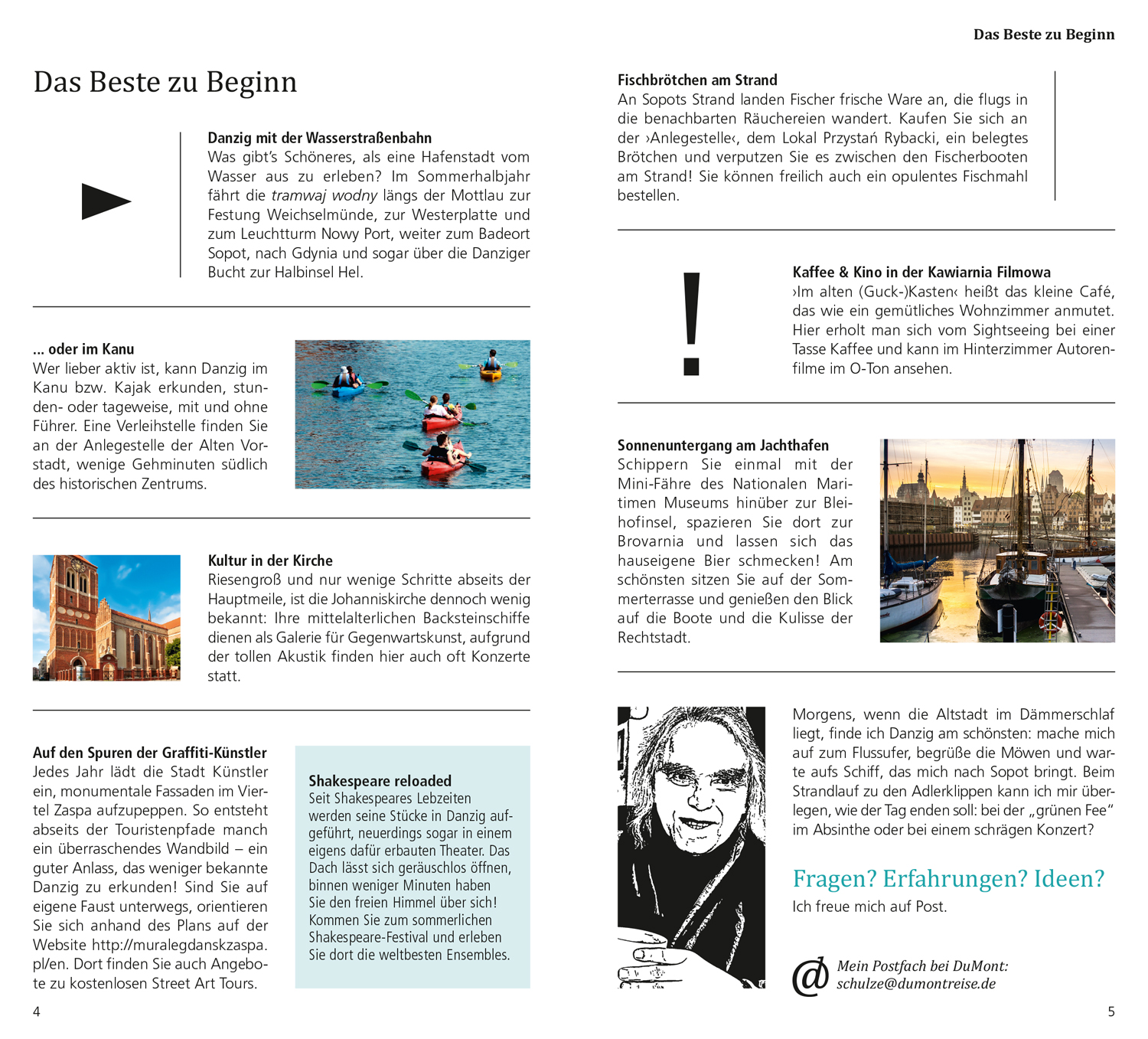 Das Beste zu Beginn. Das ist Danzig. Danzig in Zahlen. Was ist wo? Augenblicke. Ihr Danzig-Kompass. 15 Direktkapitel. Danziger Museumslandschaft. Das Danzig von Günter Grass. Die Kreuzritter in Danzig. Pause - einfach mal abschalten. In fremden Betten. Satt & glücklich. Stöbern & entdecken. Wenn die Nacht beginnt. Hin & weg. O-Ton Danzig. Kennen Sie die?